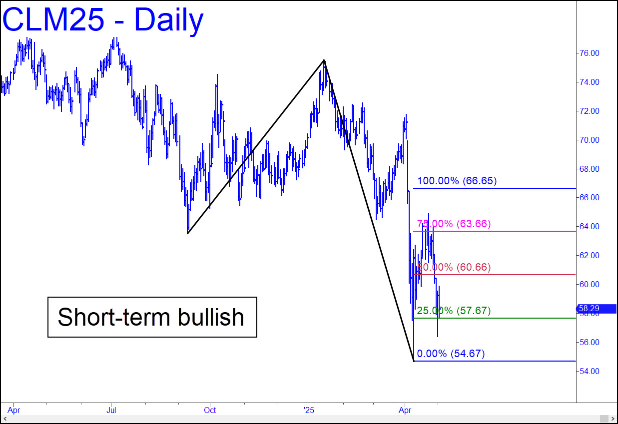 June Crude has tripped a moderately appealing ‘mechanical’ buy signal, but we’ll use it to get our bearings rather than try for a quick score. Pullbacks to the green line from the secondary Hidden Pivot (p2=63.66) are riskier to buy ‘mechanically’, at least for a move back to the target, but the set-up is often good for a one-level ride, in this case from 57.67 to 60.66. It’s too late to jump aboard, since the futures are already trading above x=57.67. Still, I’ll suggest observing what happens next to familiarize yourselves with the trade and the opportunity big retracements can create..04