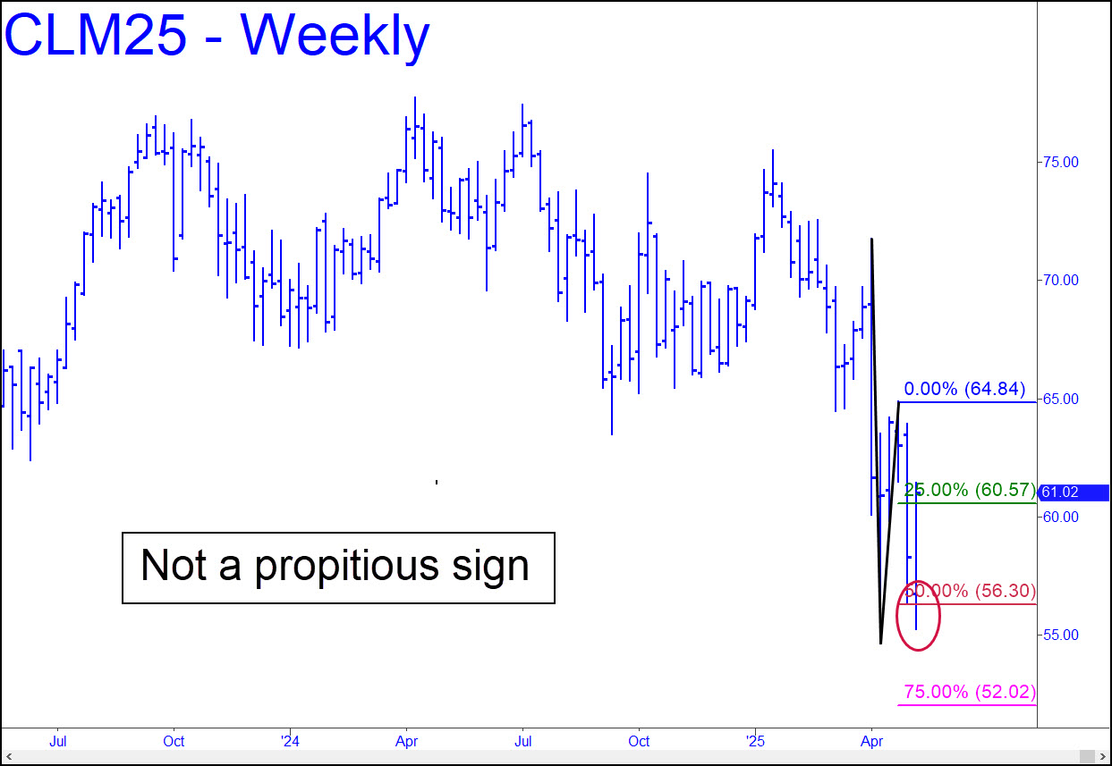 At the risk of being premature, I’ve used the weekly chart’s breach of a midpoint Hidden Pivot support at 56.30 as evidence that crude is likely to be trading lower in the weeks and months ahead. This is like trying to call Arizona’s election an hour after the polls close, but in any case, sellers’ ability to penetrate the support is surely not a sign of robust health. Even now, a rally to x=60.57, the green line, would trigger a mechanical short, stop 64.85. There is no way to estimate how long it will take for this to play out, but in the meantime, we should trade even the rallies with a bearish bias. ______ UPDATE (May 18, 12:43 a.m.): I now see that the short noted above had already triggered at x=60.57 when I posted the tout. I will track the trade nonetheless, using the suggested 64.85 stop-loss. The worst-case target for this gambit is 47.87, a conventional ‘D’ target where A=69.93 (4/3) on the daily chart. _______ UPDATE (May 19, 2:59 p.m.): I’ve been bearish or indifferent toward crude for so long that it has become a habit to predict generally lower prices. That said, a fist-pump through 65.78 would grab my attention, since it would indicate more upside to as high as 76.89. I doubt this will happen, but it’s always better to be prepared if it does.
