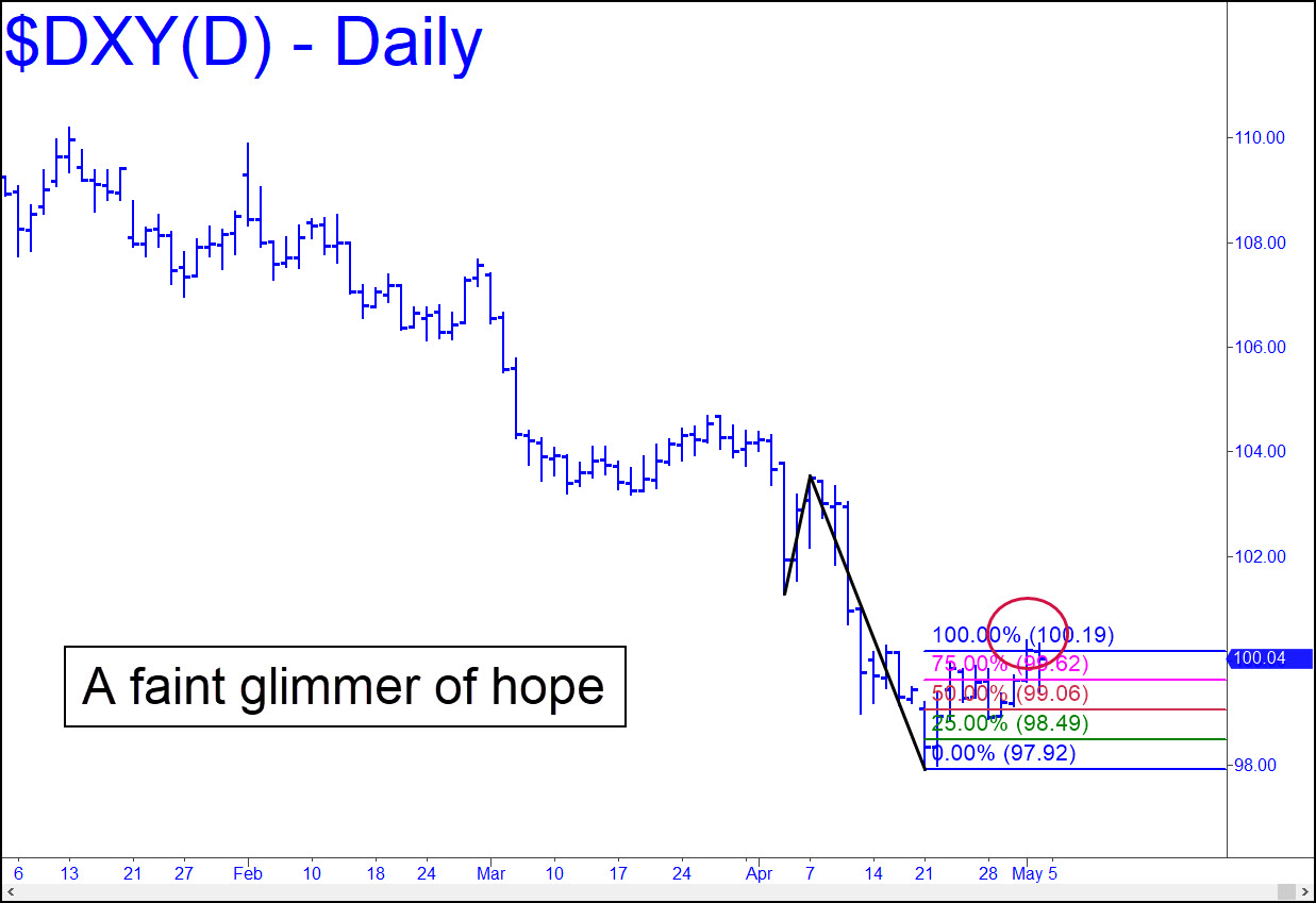 A faint glimmer of hope appeared last week with DXY’s subtle poke through the ‘d’ target of a minor reverse pattern. It isn’t much to celebrate, but the fact that the rally even made it to ‘D’ implies something may have changed, since the last time this modest feat succeeded was almost a year ago. To gauge its significance, we’ll need to monitor retracement patterns closely, since they should have trouble exceeding p if the dominant trend has in fact changed. The first in evidence, on the 30-minute chart, not only exceeded p, it topped at the ‘d’ target of a minor rABC on Friday (a=99.70 on 5/1 at 7:30 a.m.).