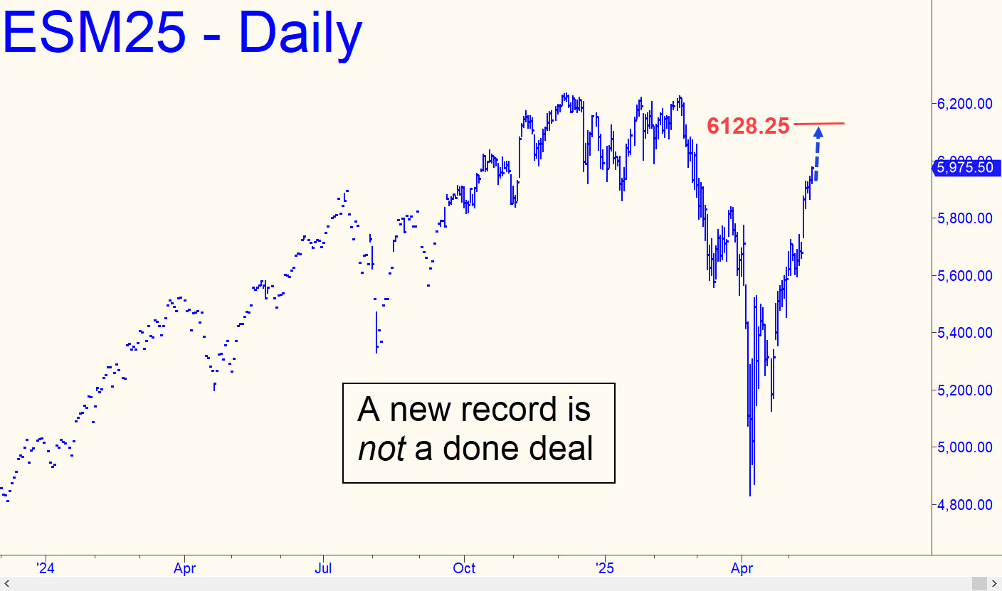 Although the rally may already have begun to feel the magnetic pull of the old high, that is no assurance a new high will be achieved. It will first have to push past a Hidden Pivot resistance at 6128.25 that has the potential to stop the rally dead. The effect is likely to be precise if it occurs at all, so you won’t have to ponder price action for more than an hour or two once the target is hit to figure out what might come next. The target is worth shorting provideddd you have the chops to pare entry risk down to 3.00 points or less per contract.