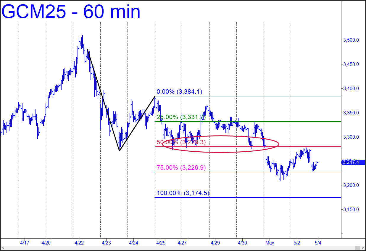 I used a tiny one-off high to draw the pattern shown, but three confirmations at p suggest it will produce only winning outcomes for us. That would imply that a drop to D=3174.50 should be bought aggressively, albeit with the obligatory micro-stop possible using a ‘camo’ trigger. One thing the chart does NOT say is that June Gold will necessarily reach the target, since the initial penetration of the midpoint Hidden Pivot was anything but decisive. Notice, however, that it delivered a profitable ‘mechanical’ short – three of them, actually – and that’s usually a tip-off that D/d will be reached. We don’t much trade ‘conventional’ patterns any longer, but this one, with its crazy point ‘a’ and asymmetry, seemed ripe for exploitation. _______ UPDATE Apr 6, 5:52 p.m.): As the chart makes crystal-clear, June Gold is headed most immediately to 3472.7, the ‘midpoint Hidden Pivot’ of the pattern shown. It can be shorted there, but only with a delicate stop-loss, since the futures will be on their way to 3736.00 in a trice if they blow past the midpoint resistance without hesitation. You could always try shorting up there, but wouldn’t it be far better to shove your accursed doubts aside for once and catch an almost certain 300-point rally?