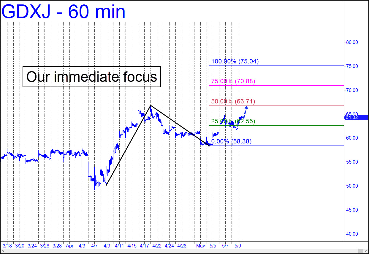 I’ve flagged two rally targets that lie, respectively, at 72.23 and 111.59. The first is ‘guaranteed’ to be reached, but I cannot yet certify the higher target as a sure thing. However, GDXJ will be drawn more immediately to the 66.71 midpoint Hidden Pivot of the pattern shown (see inset). The likelihood of this increased with last week’s failure to reach the ‘d target of a minor bearish reverse (rABC) pattern. If buyers pop it through p=66.71 easily, this vehicle would be on track for a move up to 75.04, a tad better than the assured objective at 72.23.