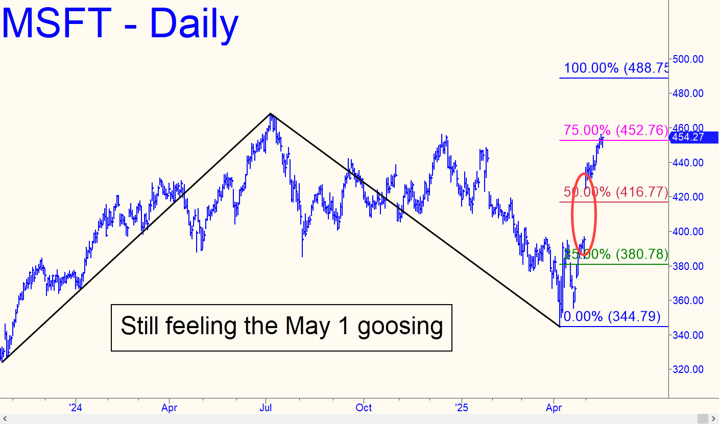 When the white-shoed crime syndicate that controls this stock goosed it for a quick 30-point gain on May 1, they probably didn’t expect to get as much additional mileage as the stock has delivered since. It now looks like a shoo-in to achieve thee 488.75 target shown. That as much as ensures that the bull market has a ways to run, since the Nasdaq is tethered to MSFT now that it has become a relative-strength engine once again. If the stock should relapse to p=416,.77, however unlikely, that would trigger a very enticing mechanical buy, stop 392.77.