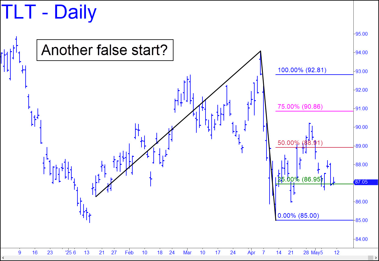 We should know soon whether Silver’s mini-explosion upward, the second in three months, is just another false start. From a Hidden Pivot perspective, the selloff of the last two weeks is not as bearish as it seems. It triggered an attractive ‘mechanical’ buy on Monday when it touched the green line (x=86.95). This implies that a bounce will reach p=89.91, at least, before it can stop out bulls with a dip beneath c=85.00. Whether it can muster a finishing stroke to d=92.81 depends on how easily buyers penetrate p on the next rally. _______ UPDATE (May 18, 12:50 a.m.): Bulls held on by a hair when TLT dipped last week to a bottom just 20 cents from the 85.00 point ‘c’ low of the ostensibly bullish pattern detailed above. _______ UPDATE (May 25): TLT popped a wheelie at an 83.66 voodoo support, but don’t expect the bounce to get legs. The low occurred just inches shy of a chasm beneath the watershed low recorded in October 2023 at 82.42. It is too obvious a place for a good bottom to form, nor do T-Bonds much respect ‘technical’ tops and bottoms. For now, all we can do is watch.