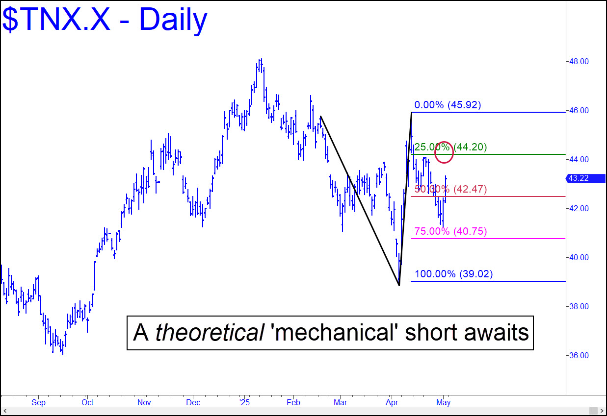 The unconventional pattern shown implies that TNX would be a short if it rises to 4.42%. This means interest rates on the 10-Year Note could be at or near a cyclical top at that level. If we treat the graph as we would any other, a fist-pump through c=4.59% would imply that rates are about to rise sharply. But if the ‘mechanical’ aspect of the trade works the way it’s supposed to, rates could be on their way down to as low as 3.90% if they reverse at 4.42%.