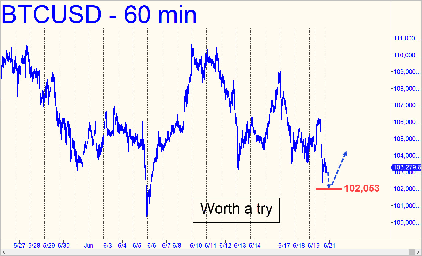 We’ve been in a tug-of-war with this rabid weasel, hoping against hope that it will get just a teensy comeuppance — a fake one, admittedly — with a feint below the grandiose 100,000 level. Saylor et al. must be quite pleased that there are no serious sellers in this vehicle, let alone short sellers. Holding it aloft is as easy as keeping a beach ball afloat in a swimming pool. My downside target remains 97,616 nonetheless, but in the meantime, I see a possible bottom-fishing opportunity at 102,053, a proprietary ‘voodoo’ support. This is a slight revision of a 101,174 correction target given earlier. Risk no more on the stop-loss than you would on a 20-to-1 filly that had a promising morning workout. ______ UPDATE (Jun 24, 9:52 a.m. EDT): Looks like Sunday’s print at 99,039 will be as low as this charmless little hoax will go. I haven’t given up on the 97,616 target, but we should put it aside now for the sake of practicality. The next stop on the way up will be at 109,243 (corrected upward on 6/24 at 3:08 p.m. EDT), my minimum objective at the moment.
