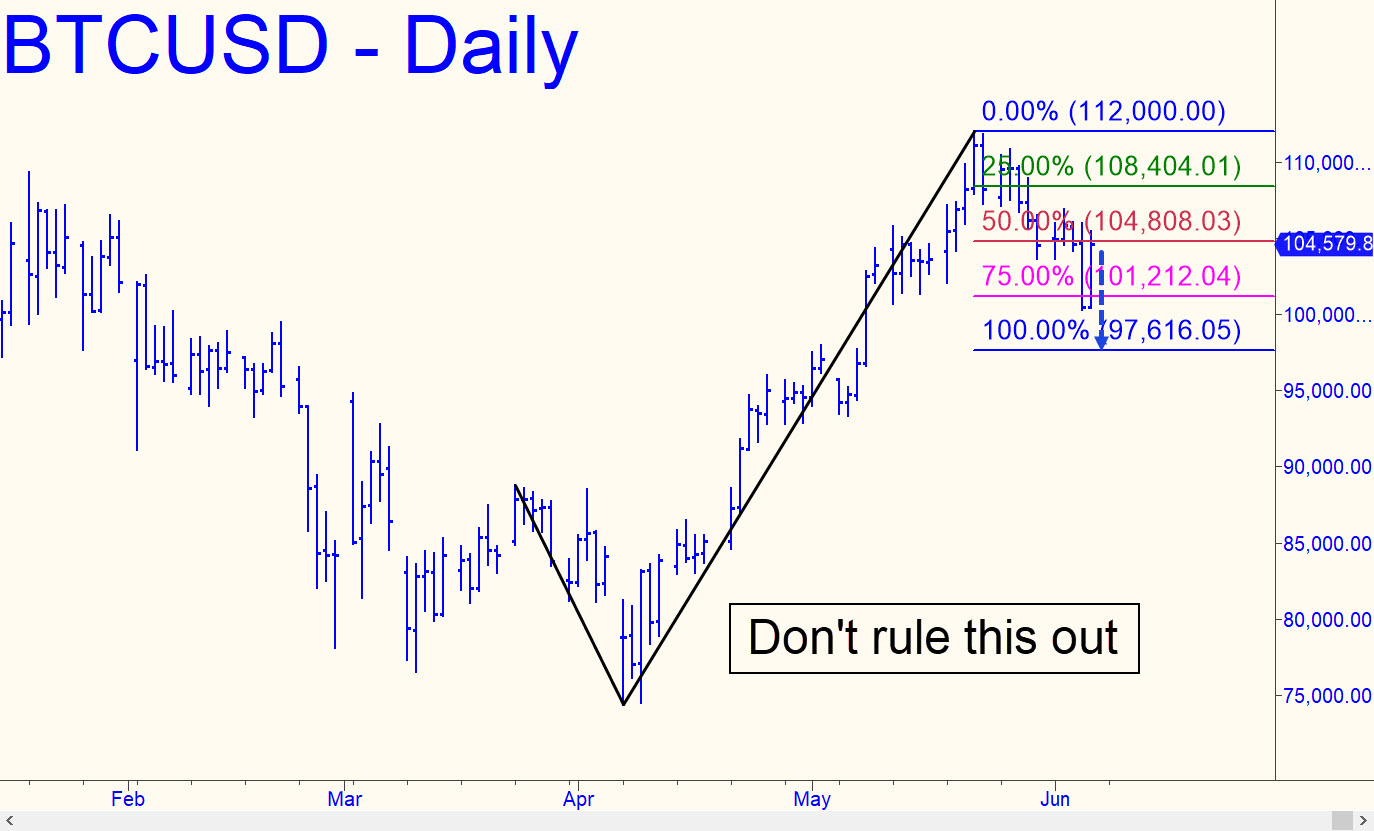 Despite the rabid-mongoose energy of Friday’s short-squeeze rally, I’m unpersuaded that this vehicle will not come down to d=97,616 before it stages a meaningful reversal. Regardless, I’d rather do my buying down there, even if we are forced later to attempt it at a higher price that will require more care and effort. In the meantime, we can test the integrity of the pattern by ‘mechanically’ getting short at 108,404, stop 112,001. We would be shooting for a one-level profit on a pullback thereupon to p=104,808. The trade is recommended only to those who are familiar with my tactics and comfortable using them.