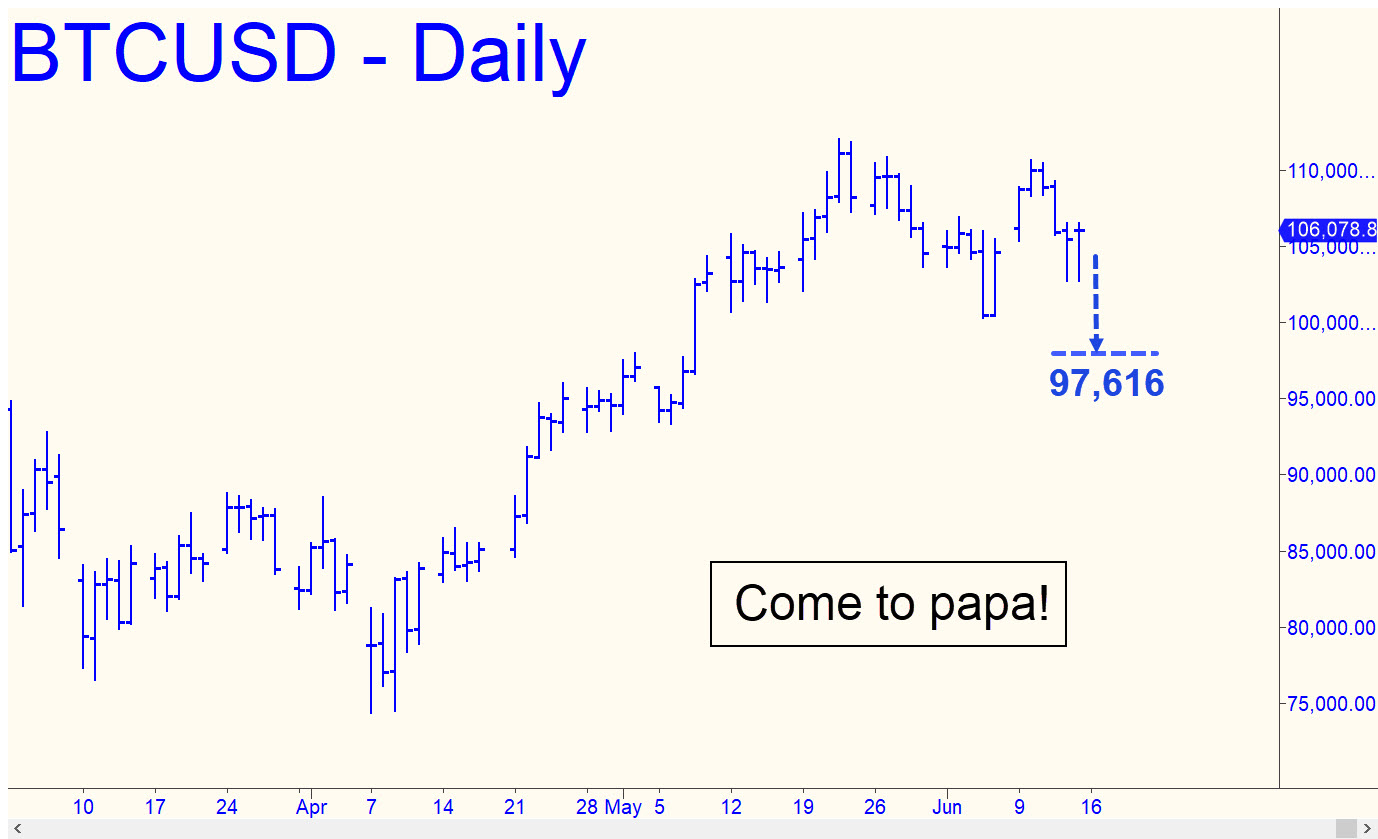 Although Bitcoin is considered one of the most volatile and challenging vehicles to trade, it is actually the unwitting bitch of Hidden Pivots, tracing out swings as predictable as rush-hour pileups on the San Diego Freeway. I have demonstrated this repeatedly with trend and target calls that have been correct at least 85% of the time. (If you have observed otherwise, by all means leave a comment.) Last week, I recommended shorting aggressively into a nasty short squeeze that pushed Bitcoin more than $10,000 higher in three days. The countertrend trade produced a gain of $3596 a couple of days later for anyone who followed my simple instruction. Will Bitcoin now come down to 97,616 as further predicted? We’ll see. If it does, plan on bottom-fishing there with a stop-loss as tight as 0.2%, or $225. Good luck!