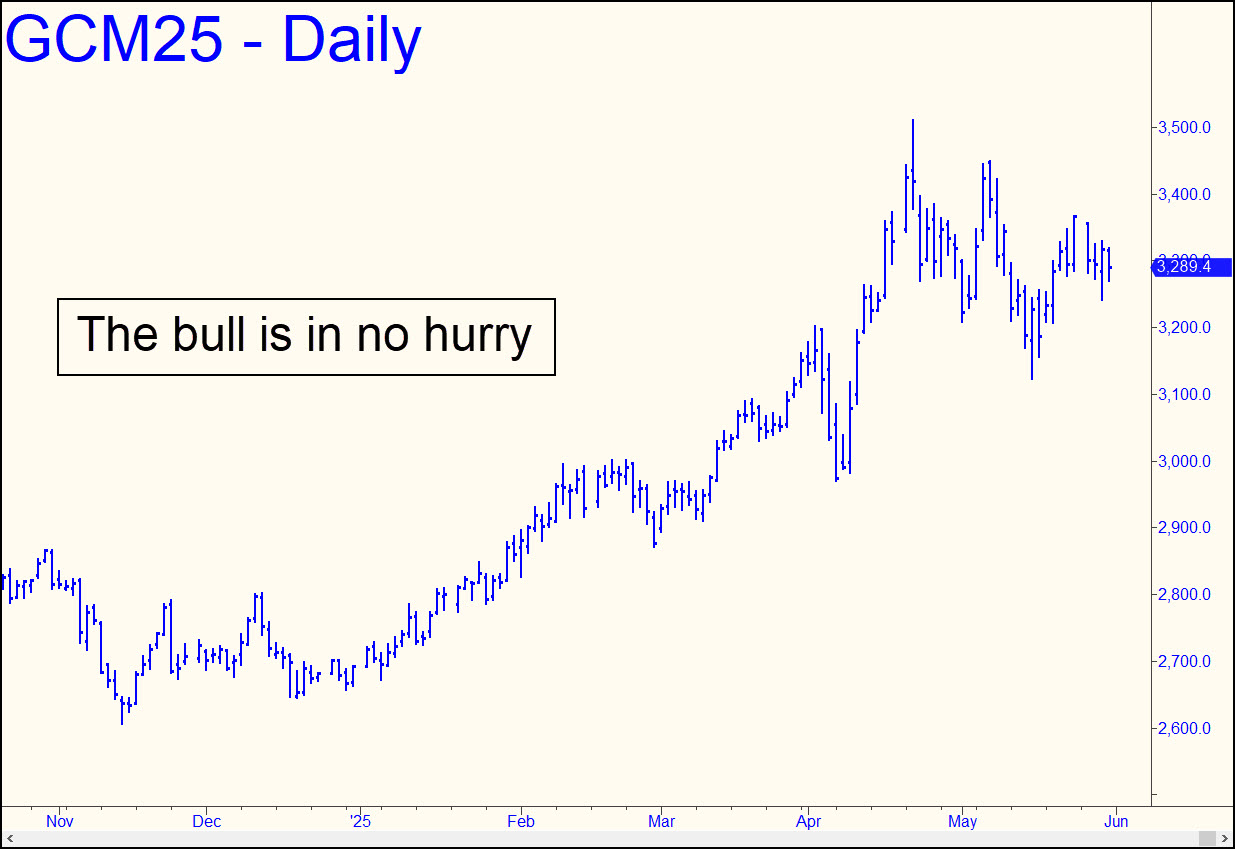 Gold’s bull market remains solidly intact, but it is in no hurry at the moment to push up to the $5000 level as its handlers presumably intend. In the meantime, expect the futures to mark time with a drift down into the $3000-$3100 range, where they could cruise effortlessly for months until it’s time to stretch the bullish imagination yet again. Alternatively, a decisive push above $3400 would imply that the sovereign entities that have been doing most of the buying sense a further escalation of geopolitical trouble on the horizon. The ‘D’ rally target associated with a 3393.10 midpoint resistance lies at 3662.80, the highest target I could foresee over the next 5-7 weeks. (Please note that 3423.20 is the equivalent midpoint resistance for the August Comex contract. It is tied to a ‘D’ target at 3695.30.) ______ UPDATE (June 3, 12:12 a.m.): An explosive overnight rally has pushed the August contract to a so-far high at 3417.80 that lies just an inch from the 3423.20 midpoint resistance I’d said was key. A decisive move past it will clinch more upside to at least p2=3559.20, and thence to the 3695.30 ‘D’ target given above as my maximum upside objective for the next 5-7 weeks.