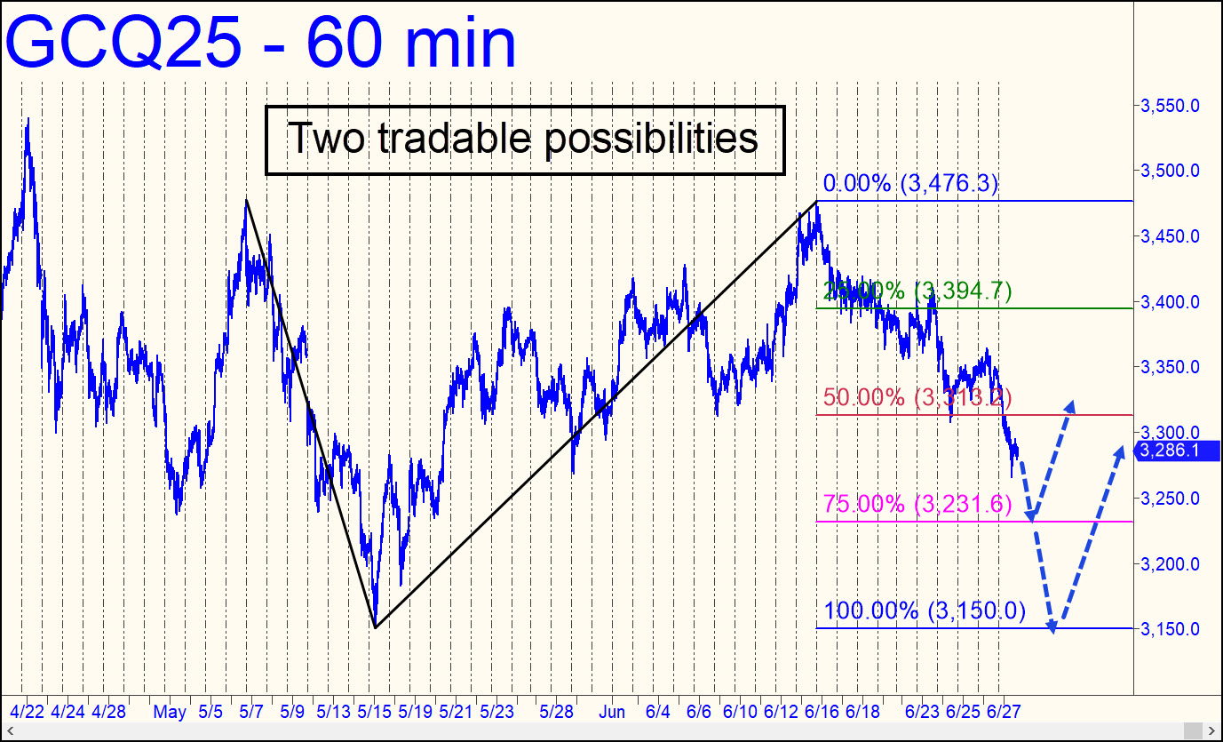 Sellers savaged the 3313.20 midpoint support with such ease last week that the futures are likely to continue down to at least p2=3231.60. And if they fail to get a strong bounce from that Hidden Pivot, expect the correction to hit D=3150.00. An additional possibility is that the turn will come from near the middle of the gap between p and p2, or between p2 and D. Unfortunately, the only way one can trade that scenario with risk tightly controlled is to watch for the turn on a chart of every small (i.e., one- or two-minute) bar chart. And here’s one more possible bottom-fishing opportunity for Pivoteers who know how to craft a low-risk trigger: 3253.30, a voodoo number. ________ UPDATE (Jul 2, 1:19 a.m.) The futures opened on a gap down to 3250.50 on Sunday afternoon, triggering a long entry at 3257.60. (The ‘reverse’ used to fashion the trigger can be found on the 30-min chart, where a=3266.50 on 6/27 at 9:00 a.m.) The pattern, the only one available, could not have produced a losing trade, but it triggered at a time of day when relatively few would have been watching. I have not established a tracking position because no one reported getting long.