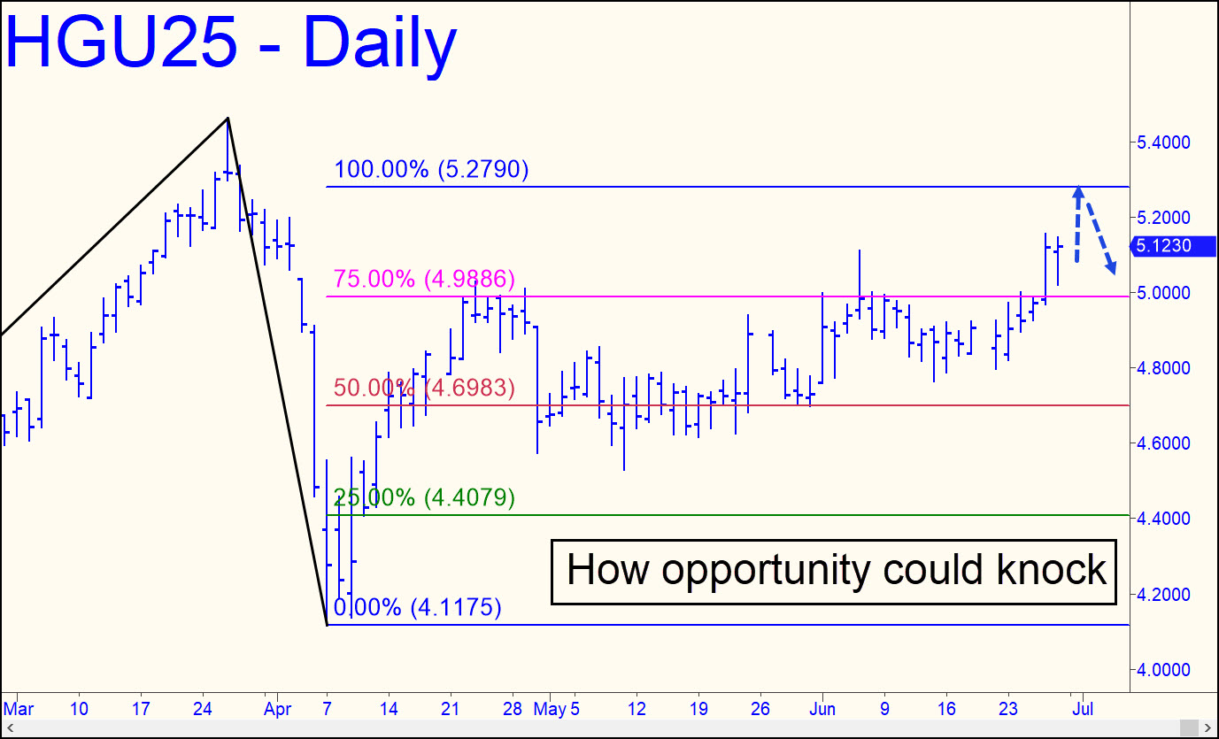 [Note: I’ve changed the core list of touts, adding some futures contracts in order to provide more tradable opportunities. The new selections will vary from week to week. RA ] There are no sure things in the trading world, but the possibilities in the Copper contract shown in the chart look quite enticing. This pattern has already paid off twice with a ‘conventional’ buy at the green line (x=4.4079), and a ‘mechanical’ buy on the pullback to the red line (p=4.6983). It can still be milked for two additional trades: 1) a ‘long’ to d=5.2790; and ) a short when d=5.2790 is achieved (which looks like a foregone conclusion). The latter trade is the more promising, since the chart holds out the possibility of an important top at or near the target. ______ UPDATE (Jul 4): The futures made scant headway last week toward the 5.2790 target noted above. Short there with a tight stop-loss if you’ve held a long position that made money on the way up. The target is the ‘d’ terminus of a large ‘reverse’ pattern begun last winter, so a reversal there could conceivably be an important one, and you should treat it as such. Here’s the chart. _______ UPDATE (Jul 11) Trump’s latest tariff threat spiked the price of copper by nearly $1.00 per pound in a single day, blowing past my 5.2790 rally target with ease. I’d suggested shorting there only to subscribers who were long on the way up, but the extreme volatility of the move could have produced results that varied significantly. I’d be interesting in hearing from those who did the trade, since it will sharpen my ability to tailor trades to suit your needs and your appetite for risk.