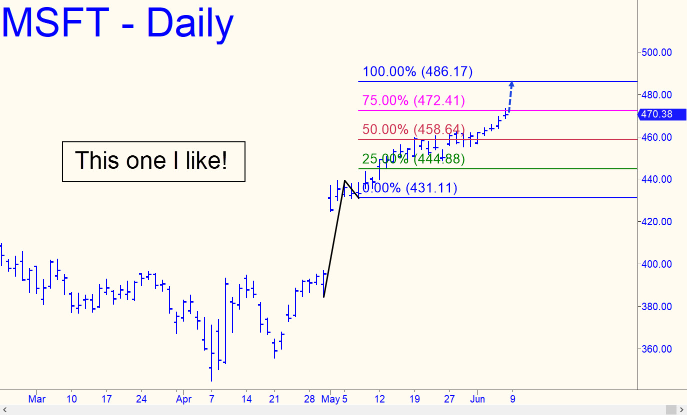 Try shorting the 486.17 target shown, since it promises a high-odds climax to the hoax rally that has wafted MSFT into the ozone since May 1. I explained earlier how this trick is done, and I will not belabor the details yet again. However, the manipulators themselves are controlled by forces they do not acknowledge, much less understand, and that’s why this pattern will work. It can also be used to bottom-fish a swoon using a mechanical bid at 458.64, stop 449.46. To enhance your odds, I will not drum-roll this target in the chat room, nor make it publicly viewable.
