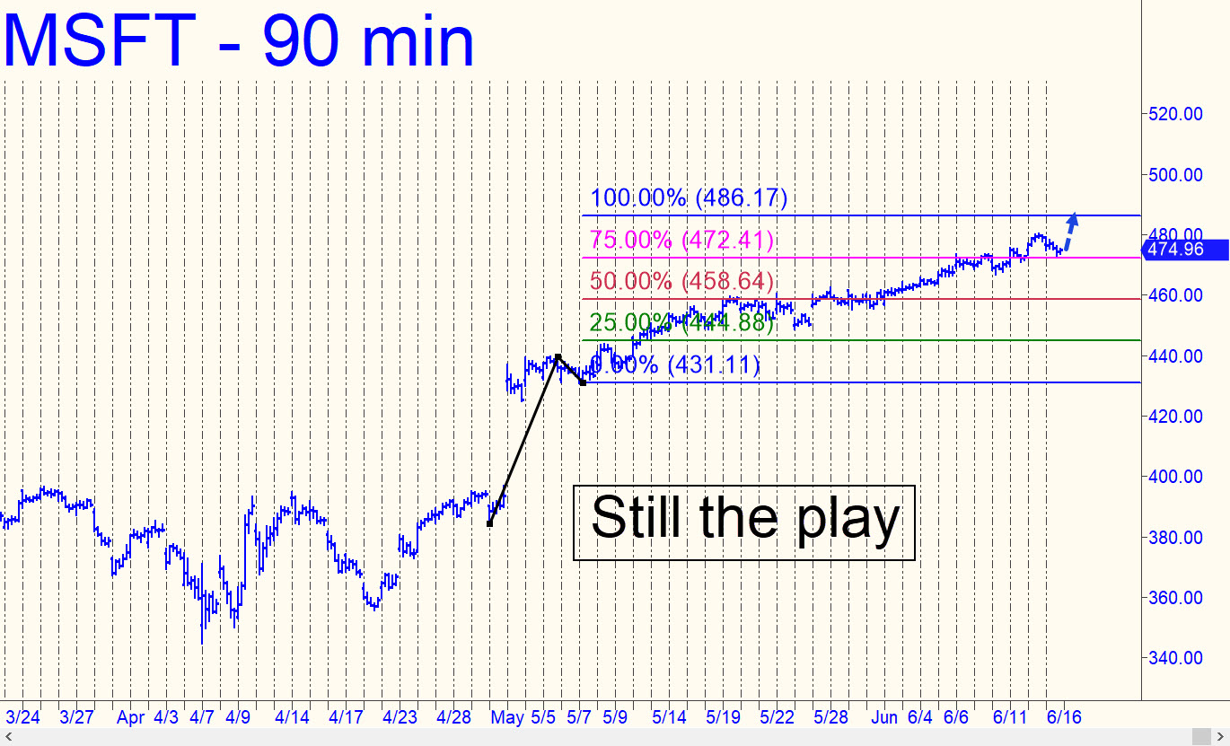 Headline news from the Middle East loosened DaBoyz’ deadly grip on shorts as the week ended, but it did not disturb my expectation of a potentially juicy short at exactly 486.17. That Hidden Pivot target was first signaled five weeks ago, and it has kept us from turning too bearish on the stock market despite an apparent dearth of buying interest in the broad averages. I cannot say exactly when MSFT will hit the target, but when it gets within a few pennies of it we should be ready to jump on some options, either naked shorting soon-to-expire calls or buying some cheapie, expiring puts. Stay tuned to the chat room for timely guidance. Also keep in mind that a major top in this stock will end the bull market begun in 2009, and that this could be it.
