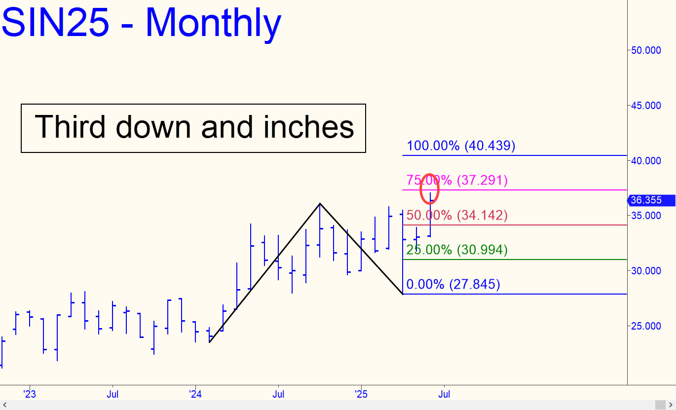 We can breathe easier when July Silver touches the pink line (p2=37.291) since that would make any one-level pullback a correction that we could buy ‘mechanically’. It would also shorten the odds of further progress toward a 40.439 target that I’ve assured you will be achieved. In the meantime, the futures are in limbo, looking for a favorable gust to help things along. If July Gold achieves a comparable target at 3695 at the same time, the gold:silver ratio would stand at around 91, down significantly from recent highs above 100.