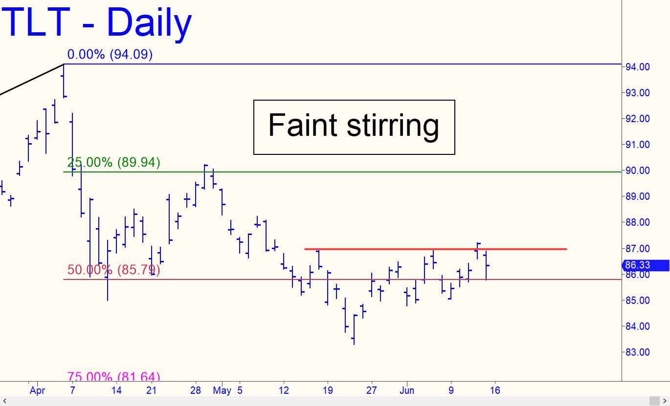 I’ve identified bearish targets well below these levels at, respectively, 81.64 and 77.49, but I’m giving every countertrend blip the benefit of the doubt so that I am not caught unawares if an important turn comes. This blip was Thursday’s gap-up rally above two prior peaks on the daily chart, one of them ‘external’. That generated a bullish impulse leg, implying Friday’s mild sell-off was merely corrective. (The weakness also failed to reach a downside ‘d’ target, which adds to the short-term-bullish picture.) Let’s see what the new week brings. If TLT can push above the 88.21 ‘external’ peak recorded on May 7, that would be worthy of serious attention. ______ UPDATE (Jun 20): A tedious, disappointing week, although by no means cause for despair. TLT still needs to fist-pump above the 88.21 peak from May 7 to command our respect.