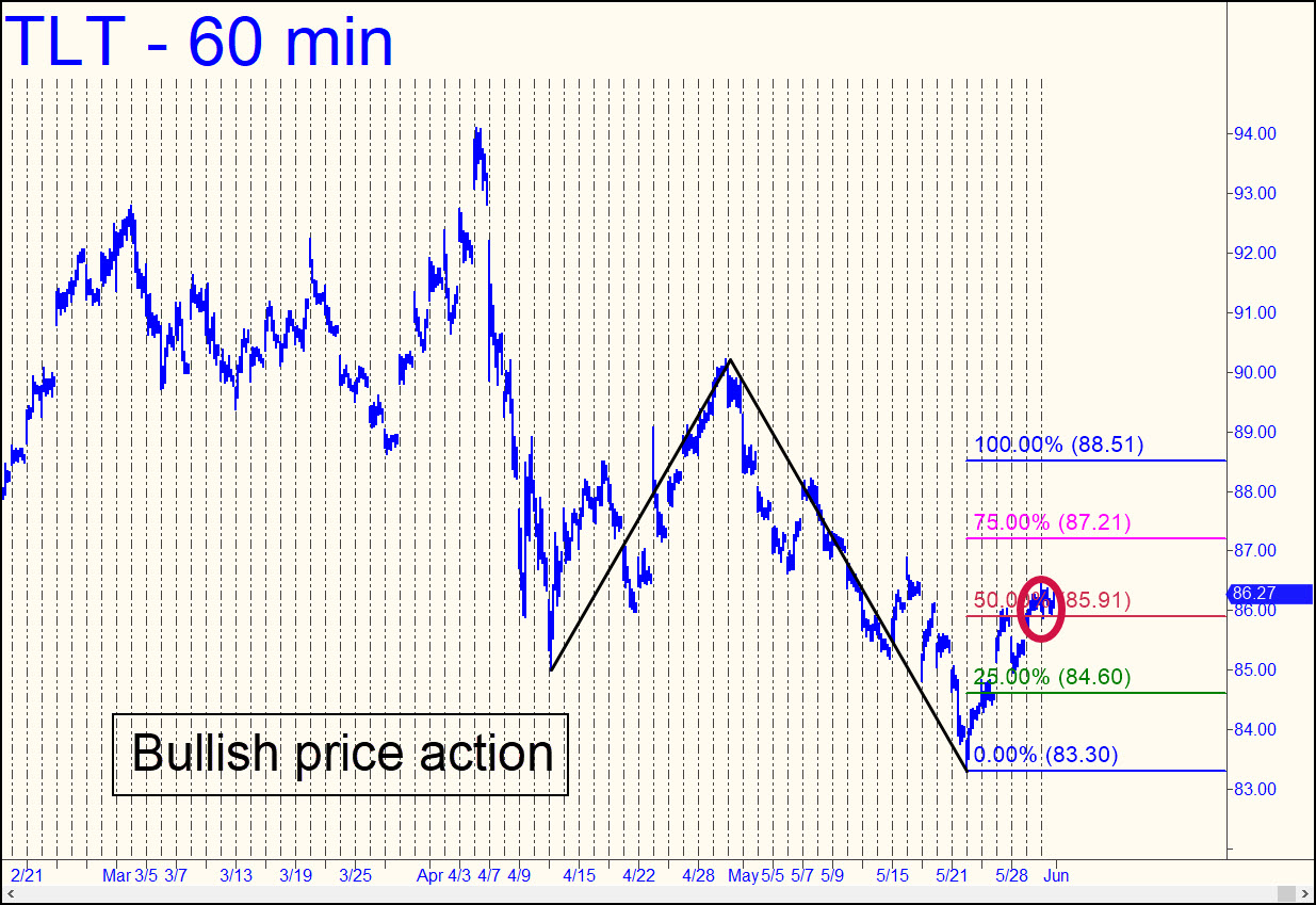 Last week’s push above the red line, a midpoint Hidden Pivot resistance at 85.91, is the most bullish price action we’ve seen in more than a month. It has given way so far to a shallow consolidation with the potential to push this symbol to the 86.51 target shown. It would also make a pullback to the green line (x=84.60) an appealing ‘mechanical’ buy. You could do so with a bid there and no stop-loss, since the textbook stop at 83.29 would probably be overkill. For now, use p2=87.21 as a minimum upside projection for the near term. Decisive progress above the pivot would shorten the odds of a further run-up to the 88.51 target.