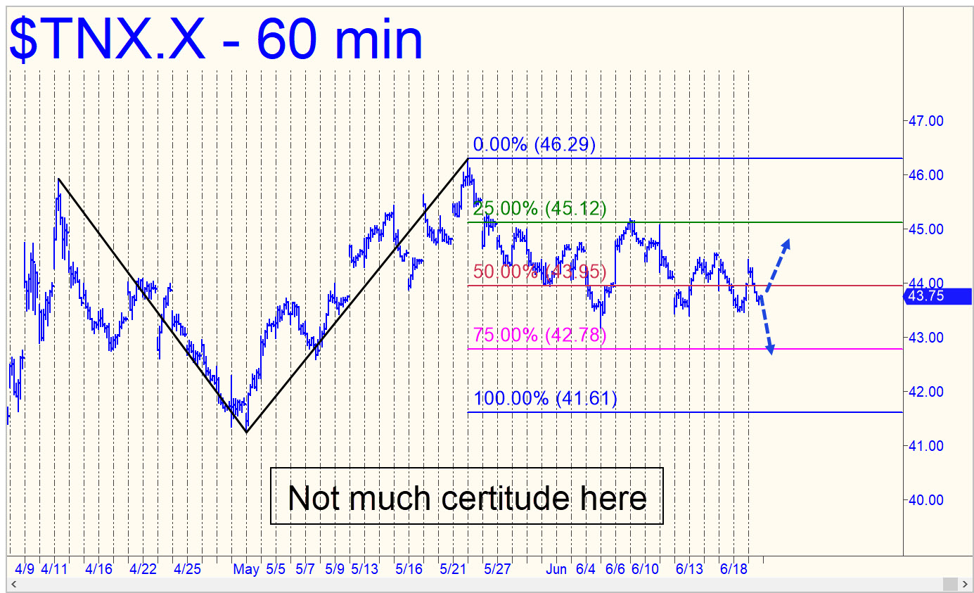 This symbol has tracked my forecast for the last couple of weeks, but what now? Up or down in the week ahead looks like a coin-toss at the moment, but if rates break lower, expect them to fall to at least 4.278% (p2, the secondary Hidden Pivot), and to take a tradable bounce from that number. Best case (for borrowers, that is) would be for further slippage to d=4.161%, which presumably would be signaled by a decisive breach of p2=4.278%. Alternatively, if rates move higher, signaled by a two-day close above 4.439%, look for a move to 4.559%.