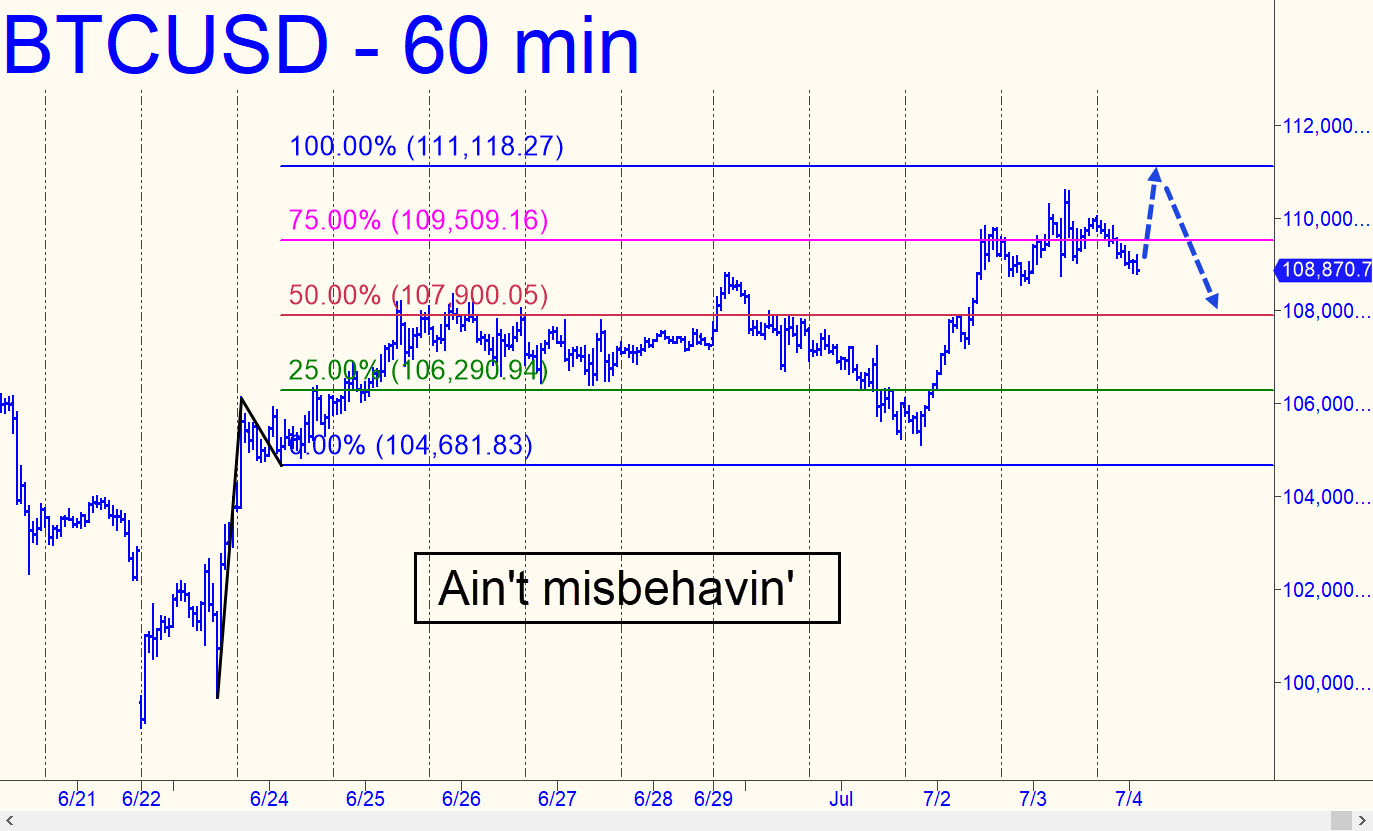 The very gnarly ABCD pattern shown is one of my favorites because it rs tripped a profitable conventional long at the green line (x=106,290): a profitable short from the red line (p=107,900); and a profitable ‘mechanical’ buy at 106,900 that was recently featured here. There are two good possibilities left: a ‘mechanical’ buy at 107,900, stop 106,827; and a short from 111,118.27. Regarding the latter trade, I expect the target to show sufficiently precise stopping power to allow a very tight stop-loss if it is hit. Even if D is not reached, which seems unlikely, it will have kept us on the right side of a bullish trend since the futures were trading below 105,000. _______ UPDATE (Jul 7, 12:31 a.m. EDT): The ‘mechanical’ trade is showing a gain of nearly $1400 at the moment, so I’ll suggest taking a partial profit if possible. If you swing for the fences, use a trailing stop that will preserve at least a nominal win no matter what. _______ UPDATE (Jul 9, 4:50 p.m.): This afternoon’s strong short squeeze impaled my 111,118 rally target, clinching more upside over the very near-term to at least 112,739. That is a clear and compelling Hidden Pivot resistance, and if buyers brush it aside, expect the rally to continue to at least 117,676.