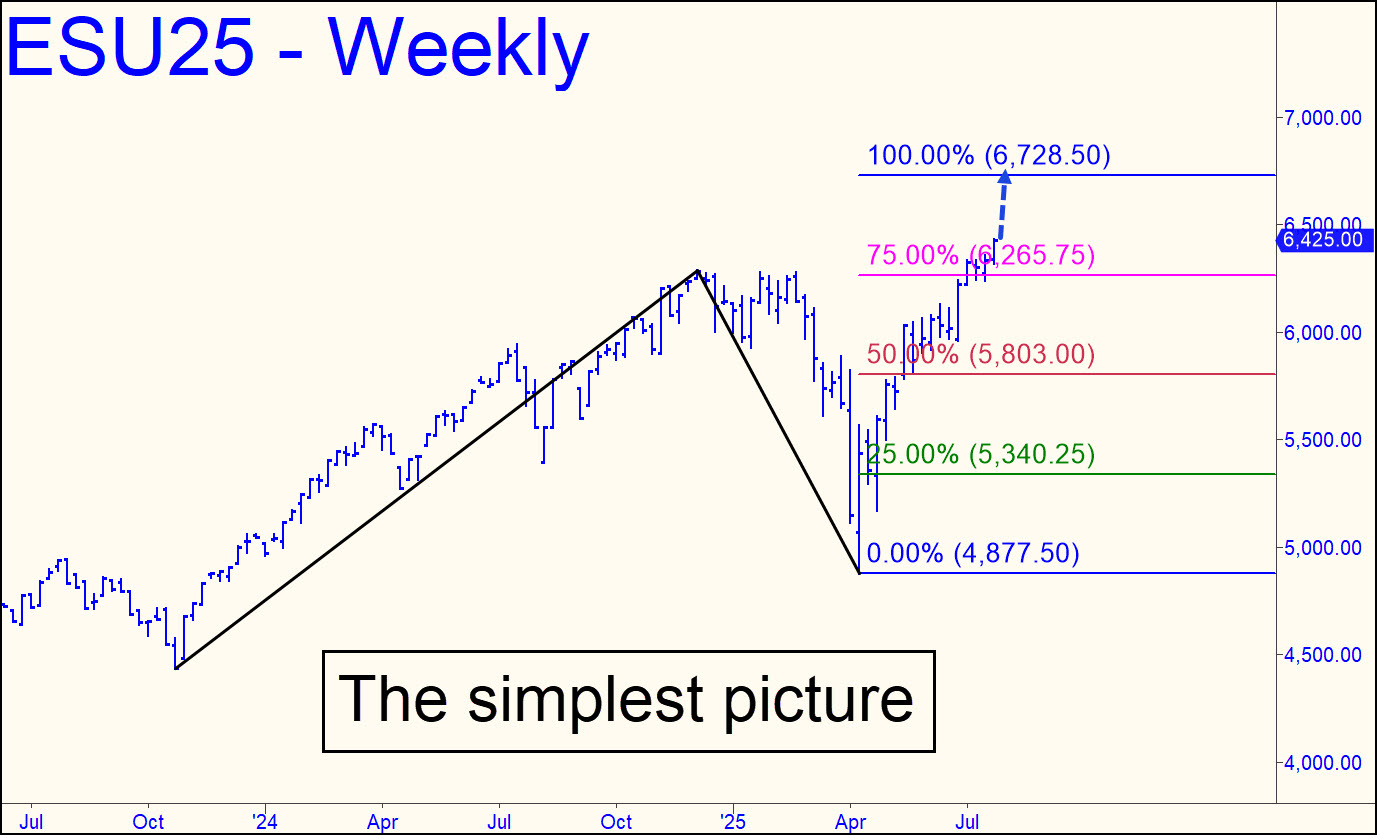 The chart shown is the simplest picture of the aging bull market that I can offer. It says that two events are highly likely: 1) the 6728.50 target will be reached, and 2) an important top will form there, possibly marking the end of a bull era begun more than 16 years ago. There is also a very small chance the party ended on Friday, since the futures finished the week within less than a point of a 6428 target that kept us confidently aboard the trend for the last 184 points. The target was an important Hidden Pivot, although not quite as important as the one at 6728. Trends occasionally fail without reaching their ultimate ‘D’ targets, but only time will tell whether this is about to happen. More likely is that short covering will power past the lesser target in mere days, much as it has scores of times since 2009.