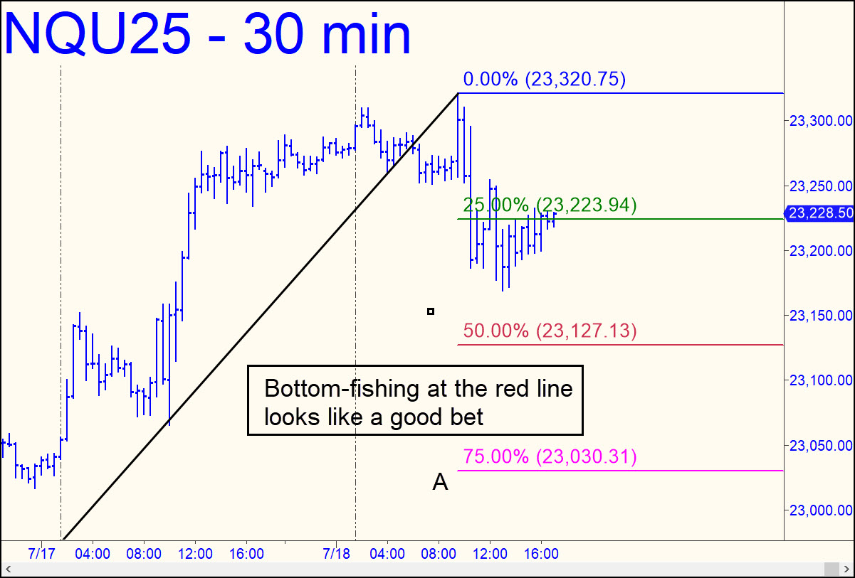 I had intended to offer mainly ‘mechanical’ set-ups for futures contracts when I changed the core list of touts a few weeks ago, since entry instructions for this type of trade are usually relatively simple. However, because I could find no such set-ups on current charts, I am instead offering a reverse-trigger trade in the E-Mini Nasdaq, as follows: Bottom-fish at the red line (p=23,127) using a trigger interval of 16 points. The low must occur within 4 points of the red line to be valid. If you do not understand this instruction, don’t do the trade; there will be other, easier opportunities. The trade is valid through Tuesday, and only if 23,233 has not been exceeded to the upside. You’ll be on your own if the order fills. It may be possible to reduce entry risk even further by using a smaller trigger pattern taken from the lesser charts, but that is expert play recommended only to ace Pivoteers. _______ UPDATE (Jul 22, 10:55 a.m. EDT): This vehicle’s nutty histrionics have altered the picture, although not the opportunity. You can bottom-fish at 23,038, using the tightest reverse-pattern trigger you can find on the 15-minute chart. This trade is only for Hidden Pivot aces (aka Pivoteers.) _______ UPDATE (Jul 27): The little snark fell no lower than 23,108, missing our niggardly bid by just 0.3%. Cancel the order and stay tuned. I will offer a new trade, but only if it permits extremely tight risk control and exceptional odds for success. Any guru with a hole in his ass can get you into a trade that produces a profit eventually after an initial, horrific swing against you. That is not the way my trades are designed to work.