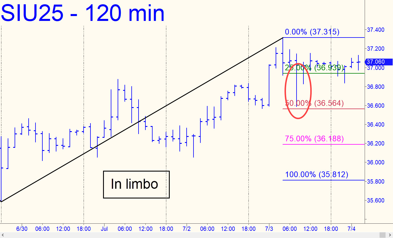 The chart provides no strong clues concerning the direction of the next big move. Usually, charts of lesser degree are helpful when the bigger charts are unclear, as is currently the case in Comex Silver. In this case, however, last Wednesday’s feint to the red line failed to touch it, denying us an opportunity to get short ‘mechanically’ when the futures rallied back up to the green line (x=36.939). The most promising trade I can discern in this chart would be to buy a swoon to d=35.812. That seems unlikely, but we should set a screen alert nonetheless so that we won’t miss the opportunity if it comes.