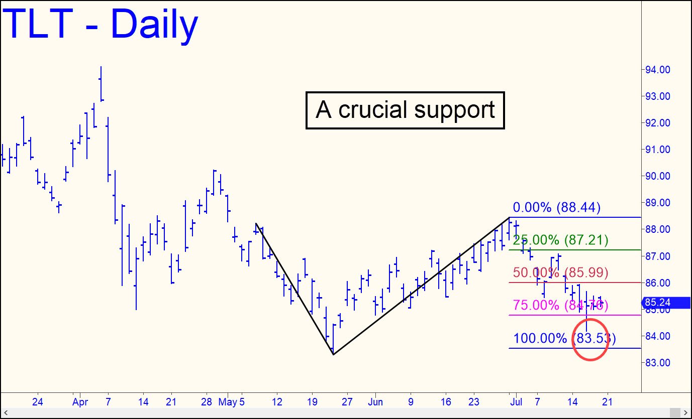 A crucial Hidden Pivot support at 83.53 doesn’t look long for this world. Last week’s dive came within 66 cents of it, but the bounce so far has been too feeble to suggest the uptrend will continue. But bulls would need to exceed July 10’s ‘external’ peak at 87.05 to give this vehicle a fighting chance. I remain convinced, however, that T-Bonds are not far from a bottom despite the fact that Trump has been doing his utmost to turn them into shit. Perhaps it will take a full-blown recession to turn the tide for Treasurys? There doesn’t appear to be one in the offing, but that could change quickly if stocks turn down hard for no apparent reason, as they always do at the onset of a bear market. Trump’s daily flip-flops on Powell, however, are bullish for stocks, since he doesn’t even have to fire the guy to strengthen the perception that tightening will be impossible on his watch.