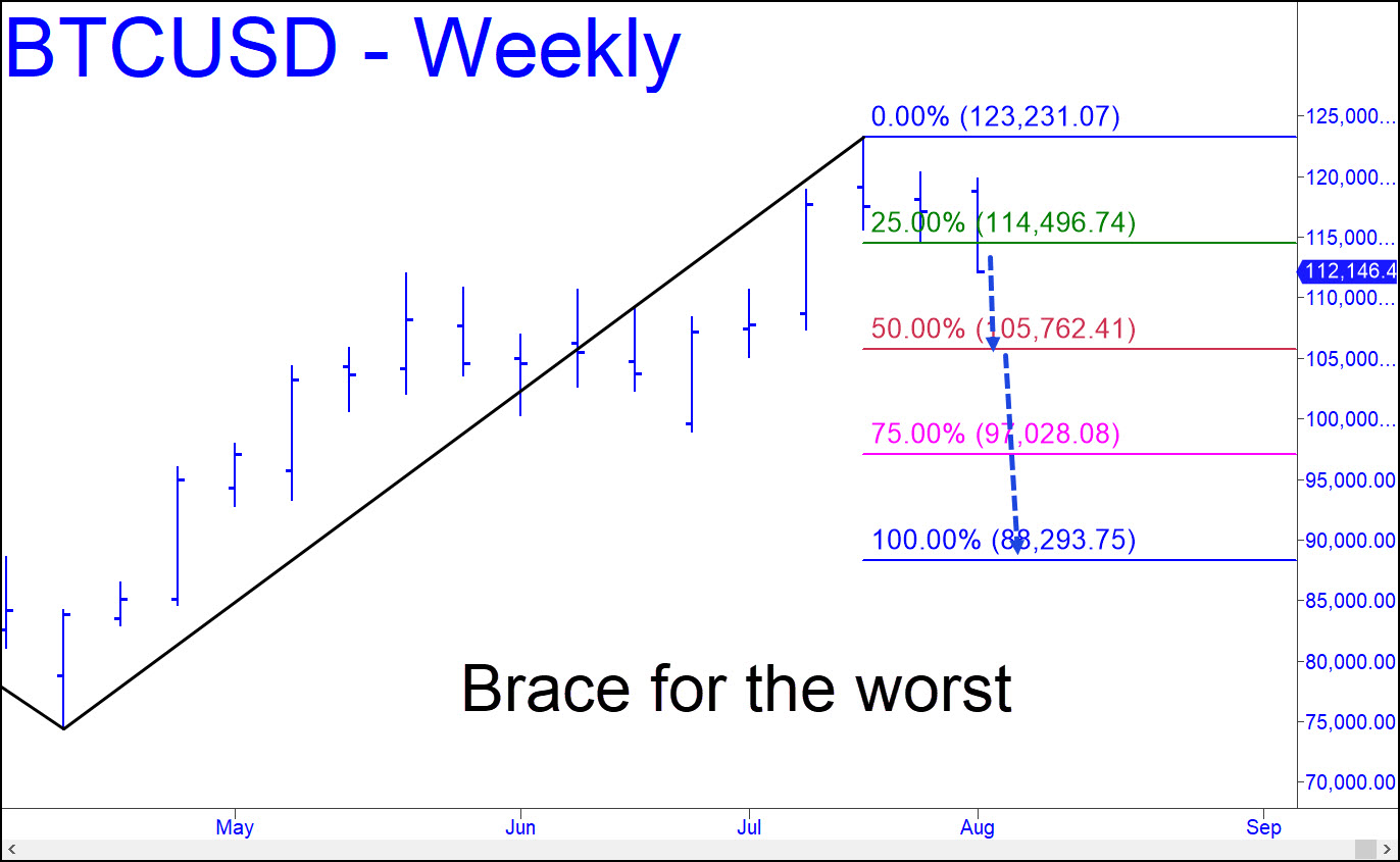 Bitcoin is getting pounded this weekend, but my hunch is that it is more than just routine selling. The slippage so far amounts to more than $5k in the last 24 hours, but you should brace for a possible fall to as low as 88,293, the ‘d’ target of the pattern shown. A decisive plunge through the p=105,762, the midpoint Hidden Pivot support, would make that no worse than an even-odds bet. My much-darkened outlook is congruent with the very bearish forecast that will go out for the E-Mini S&Ps tomorrow afternoon. Friday’s hard selling created an impulse leg on the daily chart that looks to be the start of a more serious retrenchment. _____ UPDATE (Aug 6, 7:16 p.m.): Rallies in Bitcoin and the E-Mini-S&Ps feel like distributive fakes to me. We may know soon.