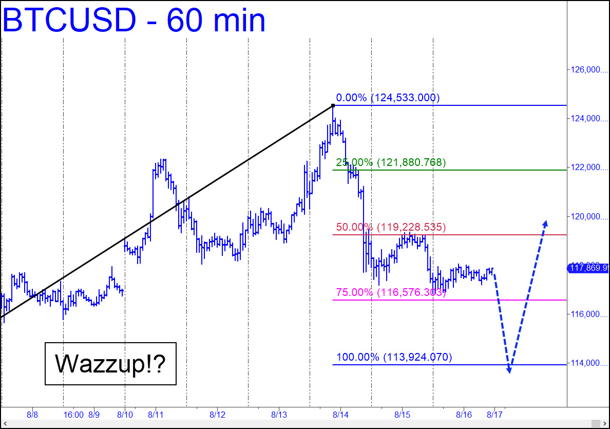 I wouldn’t touch this little hoax until it comes down to the 113,924 Hidden Pivot target shown. Bitcoin would be a spec buy there, tightly stopped, although I’ve masked the predictive pattern’s coordinates for reasons of confidentiality. Earlier, I’d expected a tantalizing low of 105,762 to materialize, but we’ve seen no such weakness. Does this portend an even higher top, as Bitcoin ascends to water-show heights for a 150-foot dive into a wet sponge? Perhaps. There is a good case for a bull-market high at 134,728, but you’d be foolish to hold out for more, no matter how strong the exhortations from pubescent experts who see the King of Cryptos rising into the zillions. _____ UPDATE (Aug 19, 1:05 p.m.): Check the chat room for an updated target (113,344, already exceeded slightly), and trading instructions. _______ UPDATE Aug 21, 1:08 p.m.): Sellers are crushing ‘concrete’ Hidden Pivot supports with ease. The next tradable ‘hidden’ support lies at 107,064, which can also serve as a minimum downside objective. If it shows little pluck, Bitcoin could be on its way down to as low as 89,595. That’s not far from a target aired here months ago that I came to view as unlikely to be achieved any time soon. Right now, though, pending confirmation by a breach of 107,064, it is looking like no worse than an even-money bet