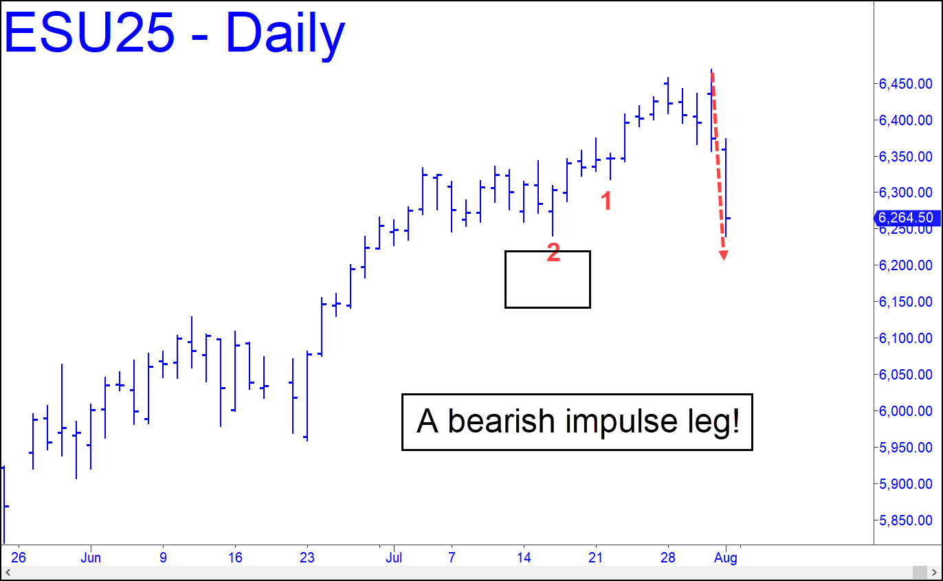 I’d said odds were remote that The Mother of All Tops is in, but last week’s dive from just above a middling Hidden Pivot target has altered the picture. The move was impulsive, since it breached two ‘external’ lows on the daily chart. Moreover, it is bearish that the futures rallied only weakly after dipping slightly beneath the moree important low, a 6241.00 bottom recorded on July 16. Now it’s a 300-point fall to the next structural support, a whipsaw bottom at 5959 recorded on June 23. That’s where the futures should be presumed headed if selling picks up steam this week, as I expect. Any rally would be a tempting short, so stay tuned to the chat room for timely guidance.