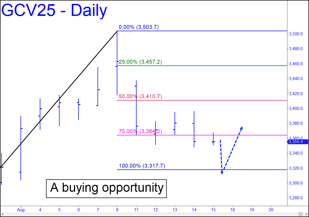 October Gold’s latest relapse has brought it down to within easy distance of the 3317.70 Hidden Pivot support I’d said would provide a risk-averse buying opportunity. At the least, the target will have spared you the pain of trying to bottom-fish this brick as it began to fall from 150 points higher. The pattern I used to project a tradable low is sufficiently gnarly that a turn from very near the target is likely. Typically, I use ‘reverse pattern’ triggers to reduce entry risk to relative pocket change on trades that go against the trend. Since this tactic could require course corrections in real time, however, I can only suggest that you bottom-fish using your own risk-management methods. If the Hidden Pivot works, the futures should reverse from within no more than 4 to 5 points of 3317.70. If one assumes the turn will come from within a point or less of the target, it’s possible to fashion a trigger on the one- or three-minute chart that limits entry risk to less than $100 per contract.