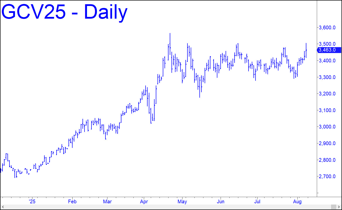 Gold went all nitwitty at week’s end on tariff news that threatened to disrupt the placid and predictable ho-hummery of the last four months. On the daily chart, the move looks like just another peak to add to a series of three highs that have contained rallies since May. However, a closer inspection reveals that the new peak slightly exceeded the others. This means that gold has broken out, and although we shouldn’t be surprised if it slips back into its accustomed wallow, we should treat a pullback as a corrective set-up for another leg up. Let’s be ready to bottom-fish at 3410.70 just in case, since that is a midpoint Hidden Pivot support (a=3478.50 on 7/23) where a turn-up would be most likely to occur. A reverse-pattern trigger is preferable for entry, but you shouldn’t need a stop-loss wider than 1.50 points. ________ UPDATE (11:13 p.m. EDT): A 1.50-point stop-loss would have gotten tagged shortly after sellers hit the red line, but a reverse-pattern trigger generated an entry signal at 3407.40 and a profitable exit on half at 3412.20 (60m, a=3418.00 on 8/8/). You’re on your own if you’re still in the trade, but don’t be greedy, since the decisive breach of p was bearish. ______ UPDATE (Aug 12, 10:26 a.m.): Gold is being made to look like garbage by sovereign buyers and bullion bankers who want it most. Most immediately, expect this manufactured plunge to hit 3317.70, a well-masked Hidden Pivot that can be bottom-fished with a tight reverse trigger.