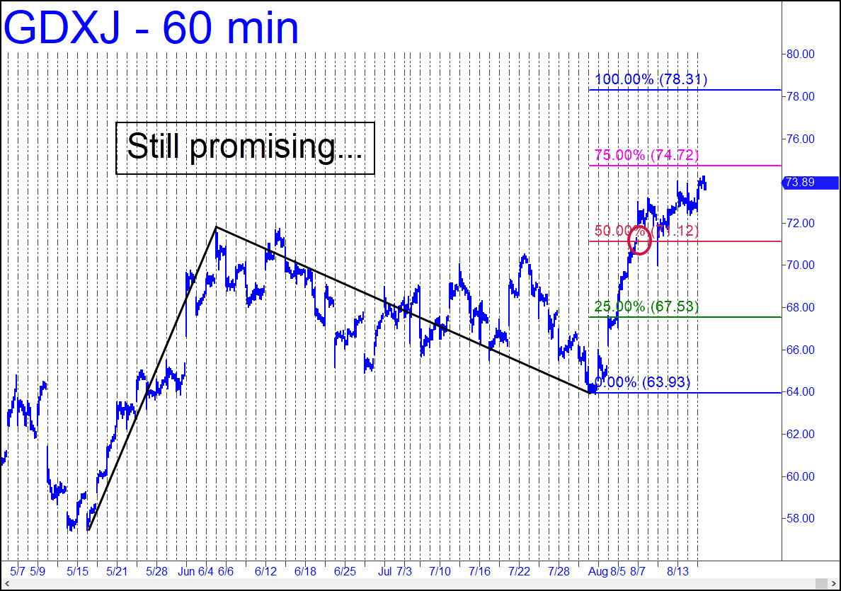 I’ve settled on the hourly chart, with an ambitious rally target at 78.31, as our lodestone. The gap through p=71.12 on first contact is not merely encouraging, it is highly favorable toward the continuation of the uptrend to at least 78.31. There is also reason for caution just above, at 74.72, a secondary Hidden Pivot that closely coincides with the 74.88 ‘D’ target of an alternative pattern displayed here last week. An imminent stall seems likely, but if it is brief, you can take that as evidence D will be achieved.