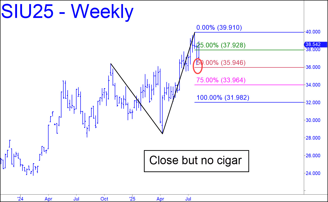 I’d said the weekly chart shown could serve as a road map for the next couple of weeks, and that is still the case. This is notwithstanding the fact that the dipsy-doodle of the last two weeks did not quite come down to the 35.946 midpoint Hidden Pivot support where we’d intended to do some buying. The pivot is sill valid for bottom-fishing, although the failure of sellers to push the September contract down to it is bullish enough to suggest that the ‘c’ high (39.910) is a slightly less than even bet to get exceeded. The best way to get ahead of the action is to follow it on the hourly chart. Here it is, and it implies the first place we might attempt tightly stopped bottom-fishing would be at p=37.770. I have masked the ‘a’ and ‘b’ coordinates for proprietary reasons, but you can figure them out by working backward from the target. ______ UPDATE (Aug 16, 2:36 p.m.): It’s no fun playing to an empty house, so let’s hear some applause from those of you who bought down at 37.770 as I’d explicitly advised. Here’s how the chart linked above evolved, producing a theoretical profit so far of $1,400 per contract.