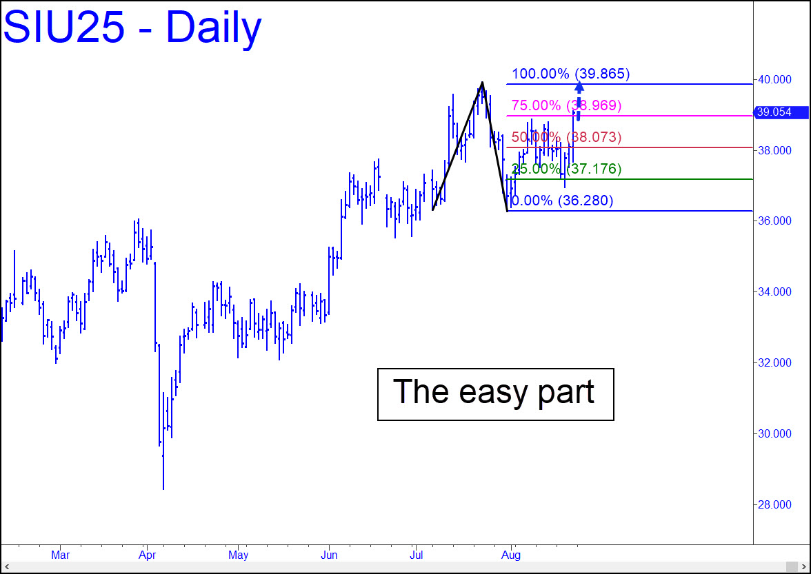 The reverse pattern shown stops short of greenlighting a rally into the void, although it says that a move to at least d=39.865 is practically certain. Move the point ‘A’ to a visually more obvious place, one low to the left, and it projects a higher ‘D’ target at 40.605. I am not skeptical that it will be reached, but I’ll be curious to see how such an obvious pattern screws with bulls’ heads. Our short-term trading bias will remain bullish in any case, but I’d suggest negotiating your entries at p or d pivots of rABC patterns on the hourly chart or less. —______ UPDATE (Aug 31, 1:54 p.m.): Silver lurched on Friday to within inches of the 40.605 target flagged above. This Hidden Pivot resistance is all but certain to show stopping power, presumably tradable and possibly precise, but let’s wait and see how buyers actually interact with it before we reassess the strength of the bull trend. ________ UPDATE (Sep 2, 1:42 p.m.): Sliding ‘A’ down to 32.100 (May 15) yields a new minimum objective at p2= 42.138, or D=44.090 if any higher.
