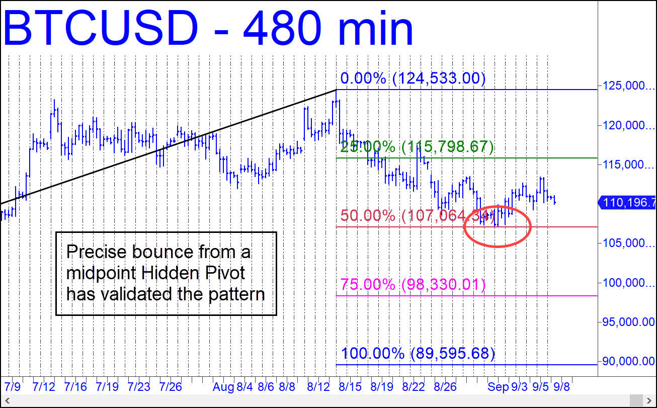 We should soon know the intentions of Bitcoin’s intrepid handlers, since the corrective move off the August 11 high at 124,533 has stalled exactly at the midpoint Hidden Pivot support of the pattern shown. This was a good place to have attempted tightly stopped bottom-fishing, even if we cannot yet predict with high confidence whether the bounce will mark the end of short-term weakness, or instead just a pause on the way down. However, if BTC breaks decisively lower, that would shorten the odds of more downside to p2=98,330, the secondary pivot; or even to D=89,595 if any lower. The pattern could also mutate into a juicy ‘mechanical’ shorting opportunity with a dip beneath ‘p’ (the red line) followed by a rally back up to 115,798, the green line.