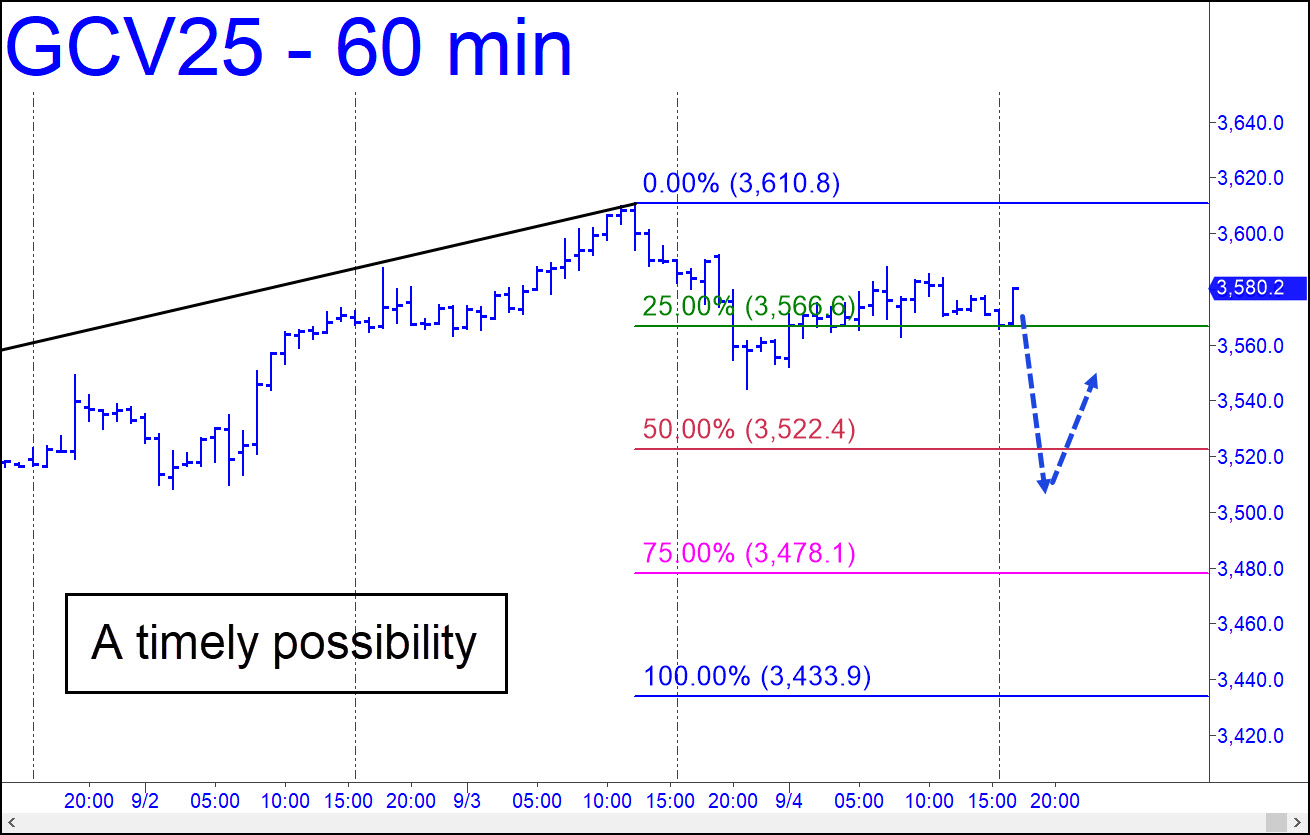 Following a sharp run-up to new record highs earlier in the week, October Gold has begun a retracement that looks likely to continue down to at least 3522.40 [corrected], the midpoint Hidden Pivot support of the pattern shown; or to as low as 3433.90 if any lower. The pivot is a logical spot to attempt bottom-fishing with a tight stop loss. Specifically, you should use a reverse-pattern trigger interval (TI) of 3.0 points or less on the 15-minute chart if the futures fall into the range 3521.20=3522.50. If you are unfamiliar with this tactic, you should use your own method of risk management to limit entry exposure to no more than $150 per contract. _______ UPDATE (Sep 5, 4:04 p.m. EDT): The futures dipped no lower than 3544 before taking off again like a bat out of hell. This left our niggardly bid choking on dust, but not without heightening our awareness that getting aboard to augment long positions will require more aggressive bidding. In the meantime, you should use 3719.70 as a minimum upside projection for the near term. A pullback to 3448.90, however unlikely, can be bought ‘mechanically’ with a stop-loss at 3358.60.