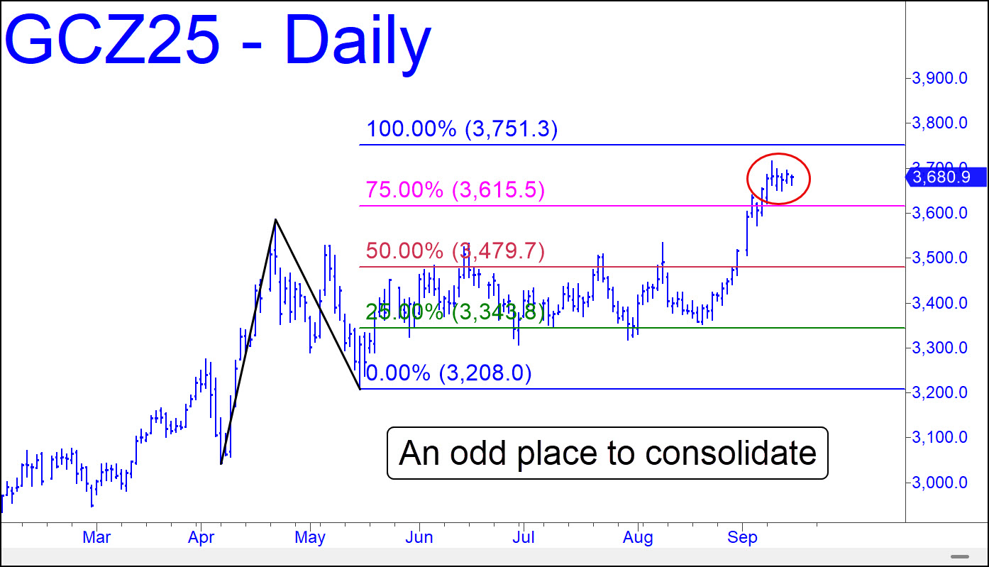 Switching from the November contract to the December yields a somewhat higher target at 3751.20. Like the earlier target at 3719.70, this one looks likely to be reached. However, the odds of an overshoot have improved by a tad. That’s because the futures spent a whole week consolidating just beneath the ‘D’ target, which would be a lot of work just to produce a marginal pop to a new high a mere $36 above the previous one. Regardless, we’ll be ready to get short there cautiously, since the pattern is compelling, even if too obvious to predict a top precisely. UPDATE (Sep 18, 12:08 a.m. EDT): Fed “news” caused the futures to head-fake to 3744.00, slightly above yesterday’s all-time high. Having frightened themselves with this breakout, traders then retreated $64 to leave our short offer unfilled. The target remains valid, although it is no longer a good bet for us.
