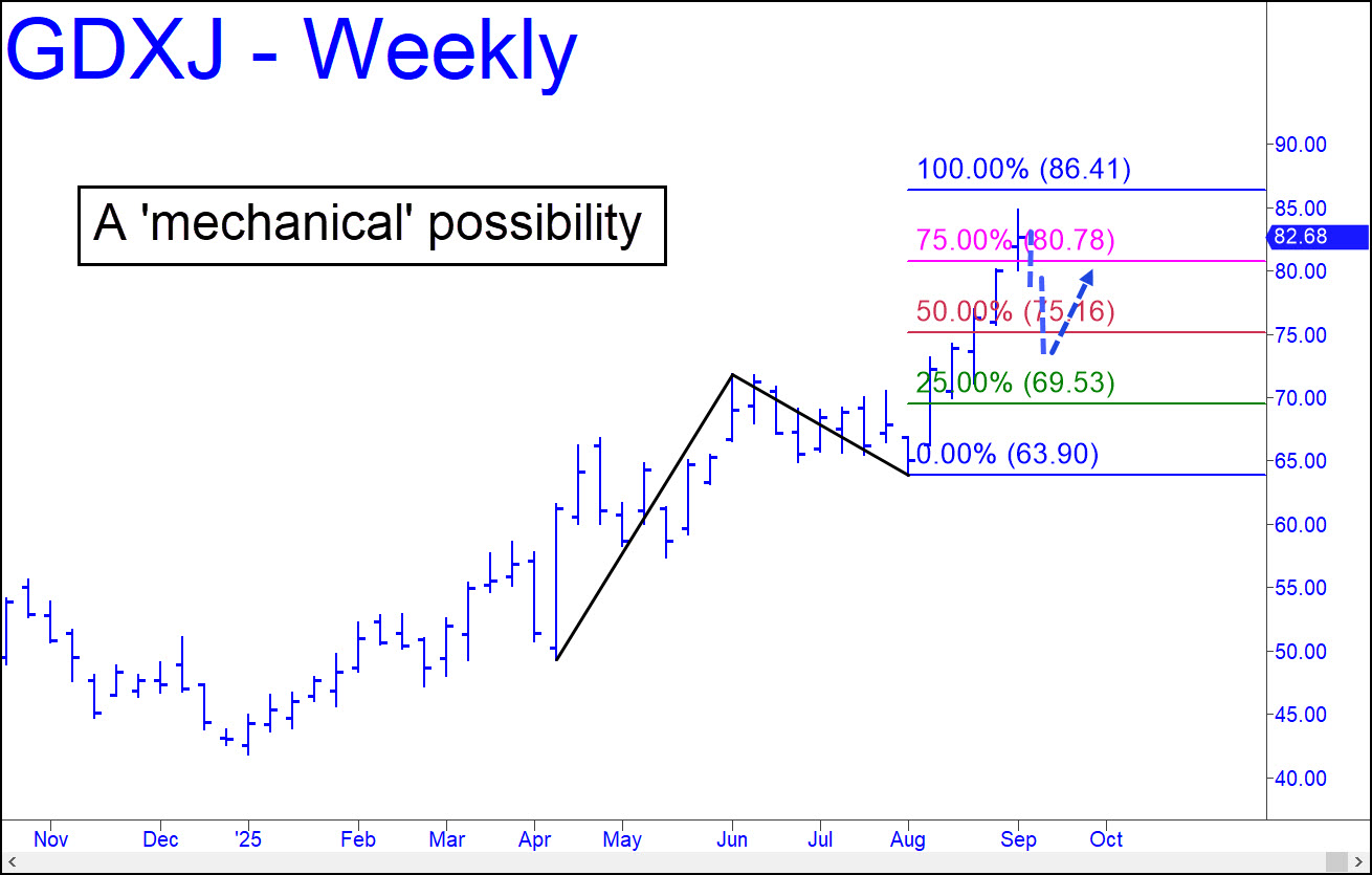 The recent surge missed my 86.41 rally target by 1.64, but the chart leaves little doubt it will be reached eventually. As much is clear in the ease with which buyers penetrated the midpoint Hidden Pivot resistance at 75.16 the first time they encountered it. Now, if this vehicle should relapse sharply, touching p=75.16, that would trigger a ‘mechanical’ buy at the red line, stop 71.41. Failing that, it could still offer excellent tightly stopped bottom-fishing opportunities at either 81.47, or at 78.17 if any lower (60m, a= 70.53 on July 22).