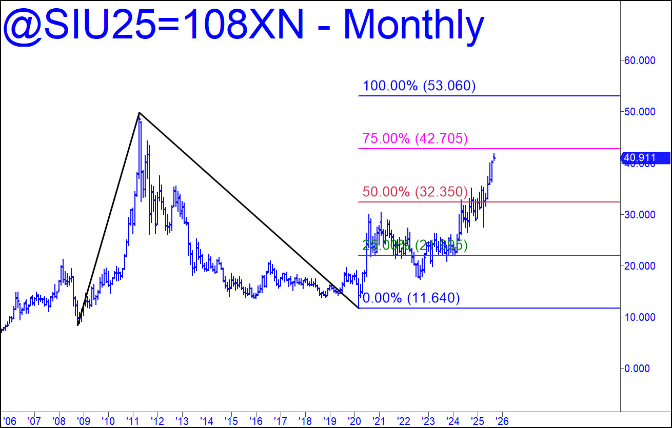 In the chat room just now, a subscriber queried me about Silver’s chances of reaching $50 an ounce. I responded as follows: The long-term pattern is too obvious to deliver precision, but even lousy patterns can work in two ways: 1) generating profitable ‘mechanical’ entries; and 2) revealing trend strength at the midpoint. In this case, the monthly chart has provided no pullbacks sufficient to trigger a ‘mechanical’ bid, and that is bullish. But the year-long struggle at p=32.350 is a somewhat bearish offset. On balance, I’d say the odds of reaching the 53.06 target are about 60%. If the bull trend is going to fail, however, p2=42.705 would be a logical place for it to happen