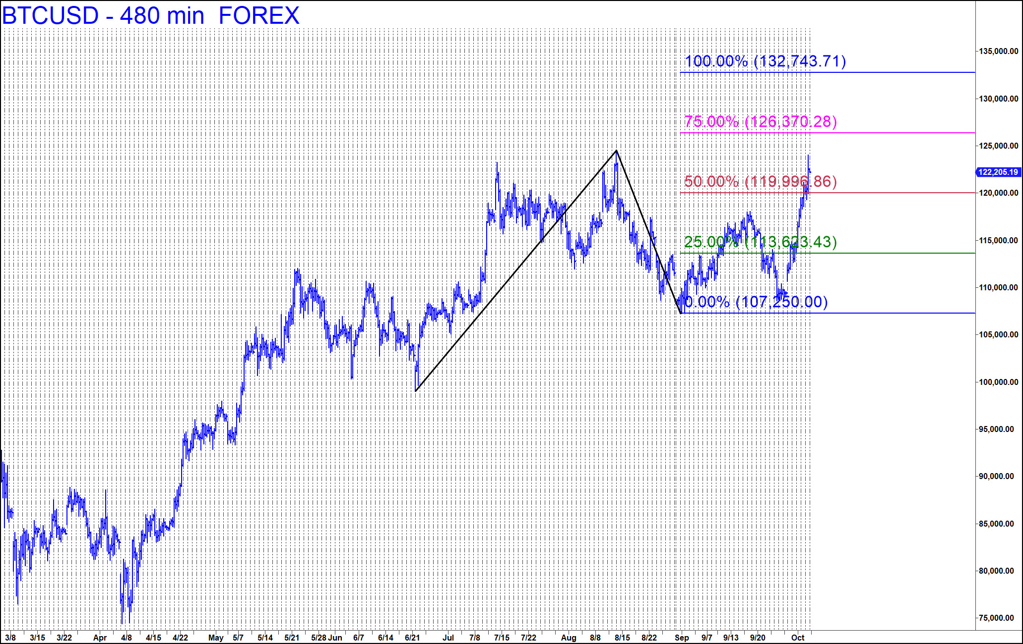 Although Bitcoin flounces around like the ritalin-dosed kleine kinder who trade it, there are no instances we can recall when its hyperactive movement fooled or confused us. It is headed unavoidably to a record 132,743 at the moment, and do with that information what you may. The rally’s decisive penetration of midpoint resistance at 119,996 offers all but ironclad assurance that the target will be reached. A tradable pause is equally likely at that price, since the pattern, although too obvious to depend on precisely, is good enough for government work. Don’t pass up an opportunity to get long at 113,623 (stop 107,249) if BTC should swoon gratuitously.
