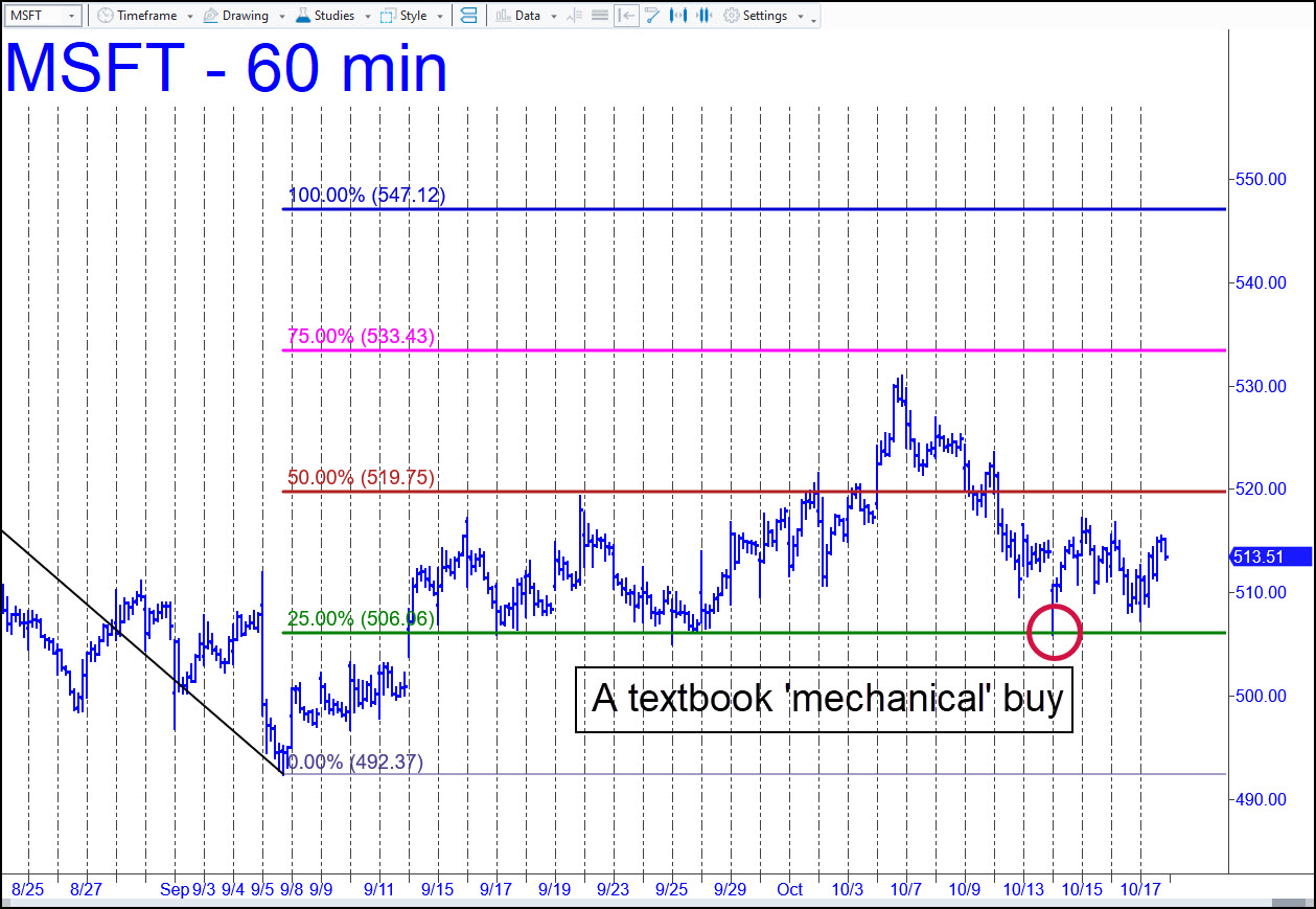 I featured Microsoft at the top of last week’s list because it looked primed to test my theory that the bull market is over. The stock did in fact go against the bearish grain by triggering a ‘mechanical’ buy at the green line (x=506.00). The subsequent rally has yet to develop legs, however, and would need to pop decisively above p=519.75 to offer a profit-taking opportunity as well as evidence MSFT is capable of reaching the 547.12 target. If that is what the world’s second-most-valuable company’s shares are about to do, it means the broad averages are going to rally strongly as well. My gut feeling is that this bounce will not be memorable, let alone record-breaking, but I’m keeping an open mind.