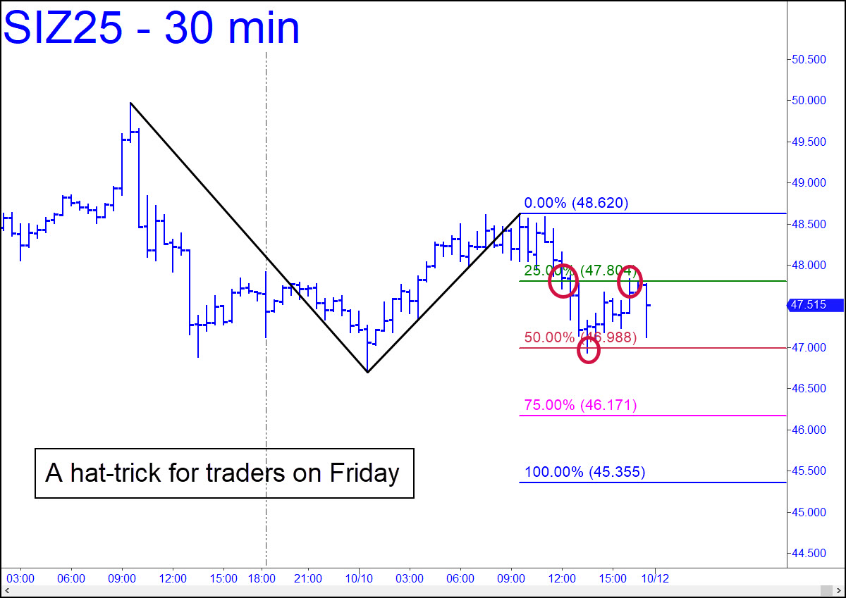 The 49.835 target I’d billboarded here caught a nasty top within millimeters, allowing subscribers to get defensive just ahead of a $3.26 downdraft. Now, use the pattern shown to keep in step. It signaled no fewer than three trades on Friday: short at the green line; long on the reversal from the red line (p=46.988), and ‘mechanically’ short again at x=47.804. That last trade has yet to touch 46.966, where half the short could be covered, and there is no assurance the position will be a winner. Indeed, if bulls seize the advantage as the week begins, they will likely negate the pattern with a very bullish push above C=48.620. Thereafter, use this pattern, with midpoint resistance at 48.828 and a ‘D’ target at 50.955. Don’t pass up an opportunity to buy ‘mechanically’ if the futures pull back to x after a run-up to our sweet spot.