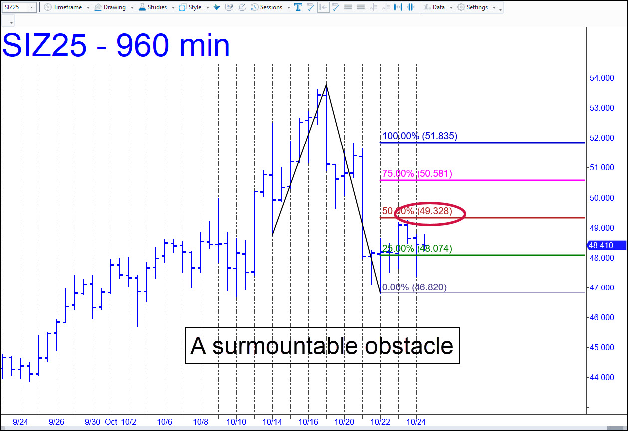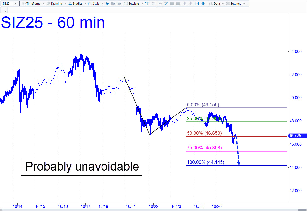The chart replicates the bullish pattern shown this week for gold (see above), although silver has yet to deliver any winning trades. Near-misses were another story, however, since the pattern would have yielded a theoretical $12,540 gain on a single contract if Thursday’s 49.225 high had been just a slightly higher 49.328. The second of the two trades that would have resulted would have been a ‘long’ at the green line (x-48.074) that would have shown a small profit at the bell on Friday. (For details, check out my 21:21 post in the chat room Thursday night.) Looking just ahead, I expect gold to pull silver higher when the week begins. That implies a push past p=49.328, followed by a run-up to at least p2=50.581, or to d=51.835 if any higher._______ UPDATE (Oct 27, 1:24 p.m.): This morning’s plunge through the red line (p=46.650) means the downtrend is likely to continue to at least D=44.145. This is even though the pattern is a conventional one that every trader on Earth is aware of. A bounce up to the green line (x=47.903) should be shorted ‘mechanically’ with a small-pattern ‘camo’ trigger.