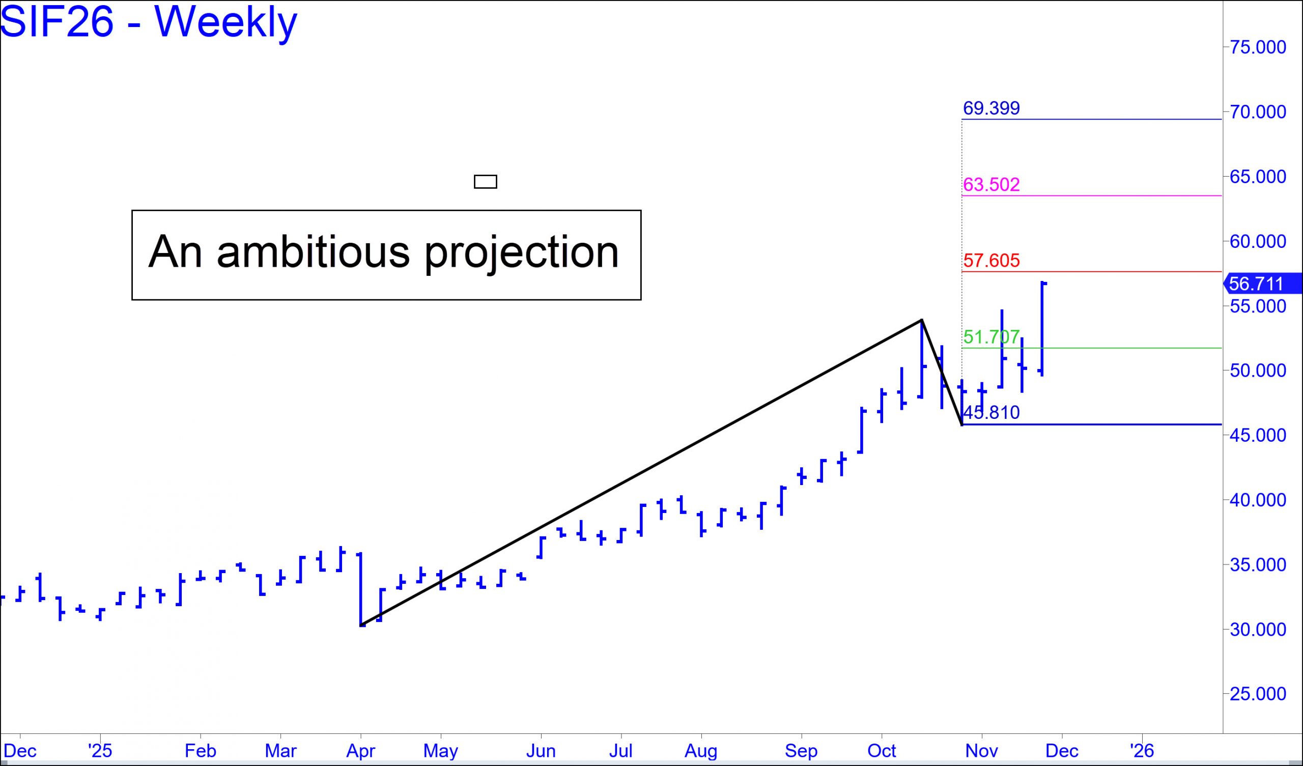 The 63.39 rally target is ambitious, considering we’ve yet to see how bulls handle the pattern’s midpoint Hidden Pivot resistance at 57.60. It became a logical minimum objective two weeks ago, when the futures first popped through the green line (x=51.70). The pattern is unusually elongated, but because of the rough visual symmetry between the two down-legs at either end, it winds up being the only ABCD configuration available on the weekly chart. Regardless of its quality, price action at p cannot but tell us whether bulls have the energy to power this vehicle to the target. Since the trend is so well-developed, however, jumping on and off will be difficult at best and should be managed using ‘camo’ (i.e., small-pattern) trade triggers in either direction.