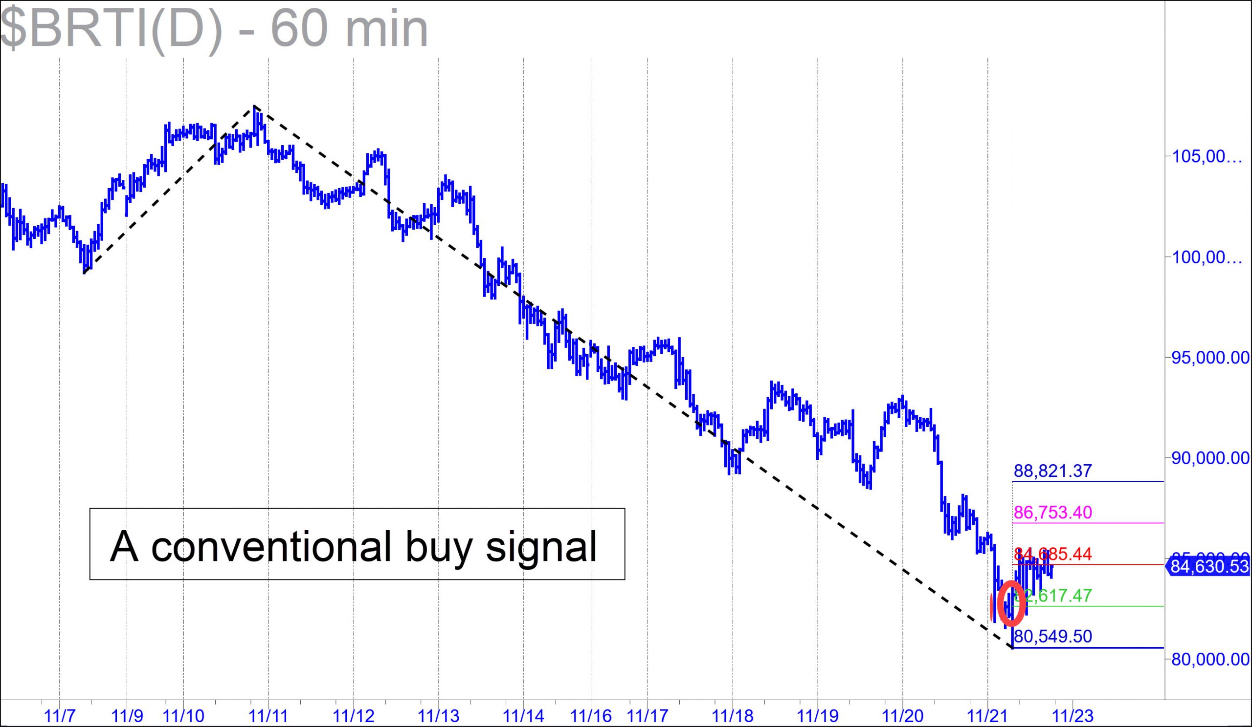 Bitcoin is due for a bounce, so I’ve focused on the smallest possible instance of it on the hourly chart. It tripped a minor buy signal at 82,617 on Friday, then delivered an opportunity to take a small partial profit 86,685, the pattern’s midpoint Hidden Pivot resistance. The overshoot of p was slight, but it is still sufficient for us to infer the bounce will achieve the ‘d’ target at 88,821. Scalpers can short there provide they’ve made a profit on the way up and that they are able to keep entry risk down to 0.1% or less. The short squeeze powering this oversold rally could be nasty, so be prepared for significantly higher prices, albeit not to a new record high. (UPDATE: Bitcoin is a nuisance for me to track because it never stops to observe a sabbath. The analysis above was prescient and precise, as you have come to expect from Rick’s Picks. However, between the time I prepared the forecast a day ago, when this symbol was trading for around 84,630, and now (Sunday morning), it has frog-leaped higher and will soon be at my 88,821 target. I don’t ordinarily publish a new slate of touts until late Sunday afternoon, but I’m going to hit the send button on this update now, since I don’t want it to appear as though I am predicting the little s.o.b.’s every move with hindsight. As long-time subscribers will have observed, it is no great trick to forecast Bitcoin’s hysterics precisely and consistently using the Hidden Pivot Method.)