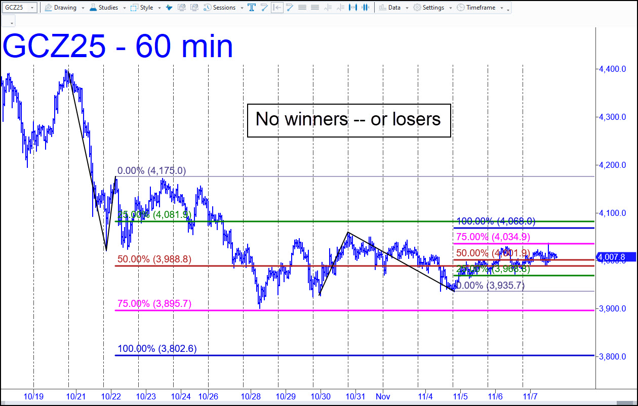 I don’t usually post charts that display more than a single ABCD pattern, but the one shown gives a clear picture of how very unclear gold traders and investors are at the moment. Neither the large bearish pattern nor the small bullish one produced a decisive move through p, muddying the question of whether the next significant move will be up or down. Bears have a slight edge, I’d say, but it’s based on technical trivia that’s not worth explaining. For now, the worst-case target if the futures break down is still 3802.60, representing a 5% drop on top of the 8.5% loss since October 20, when Gold recorded an all-time high at 4398. ______ UPDATE (Nov 10, 12:47 p.m. EST): The futures have broken out above late October’s peaks. Trust this rally when it pushes above more important peaks ranging up to 4175.00 recorded between Oct 22-26.