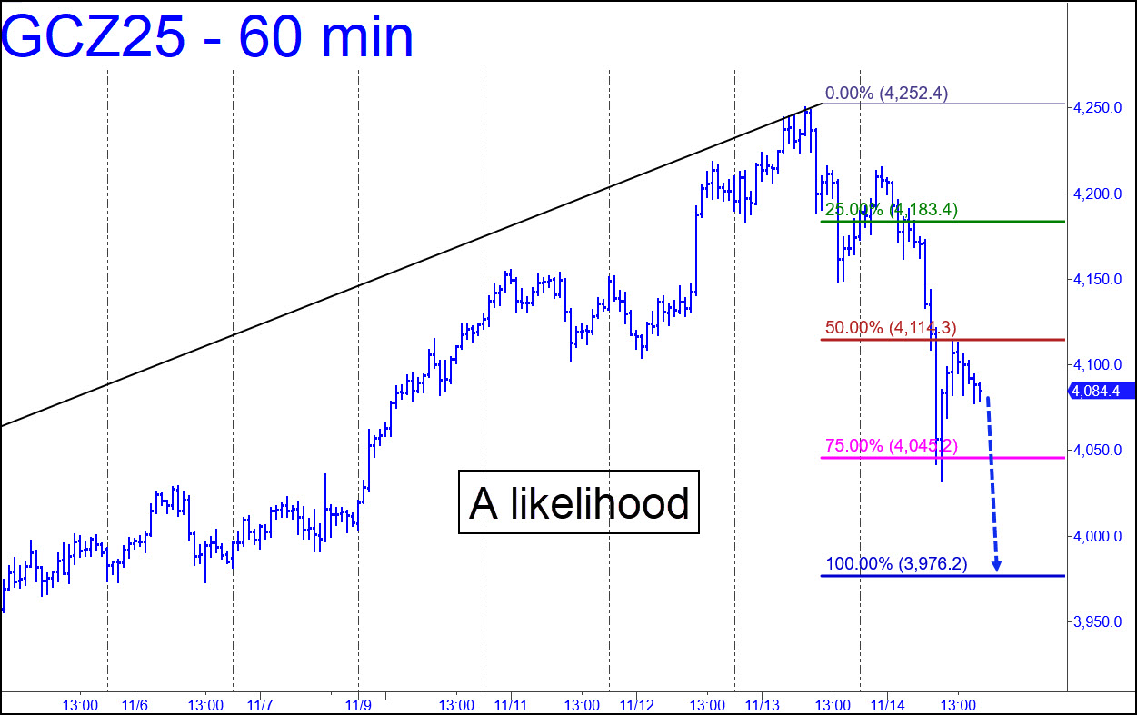 Friday’s carnage left the futures on track for a likely relapse to the 3976.20 target shown in the chart. A bullish alternative would start with a rally exceeding Friday’s intraday high at 4215.10. New record highs would become an odds-on bet at that height. Because the reverse pattern yielding the 3976.20 target, a Hidden Pivot support, is not obvious, bottom-fishing there is recommended. I’d suggest using a ‘camo’ trigger from a lesser intraday chart to do this, however, since there are several prior lows to the left that are likely to attract competition from overly eager buyers, some of whom are as clever as we are. ________ UPDATE (Nov 18, 10:29 p.m.): Buyers came back to life, giving the futures a possible reprieve. The uptrend projects to 4144.60, and a pullback to 4034.20 can be bought with a 3997.00 stop-loss. The rally will still need to exceed 4215.10 to tell us that bulls are ready for a charge to new record highs. _______ UPDATE (Nov 20, 9:03 a.m.): The futures have rallied as high as 4096 after lightly kissing the bid I’d suggested above at 4034.20 with a 4034.00 low. The subsequent rally could have produced a profit of more than $6000 per contract, but I have not established a tracking position because no one mentioned it in the chat room. The 4144.60 target has yet to be achieved, and the effort is not pretty to watch, but it remains valid nonetheless as a minimum objective.