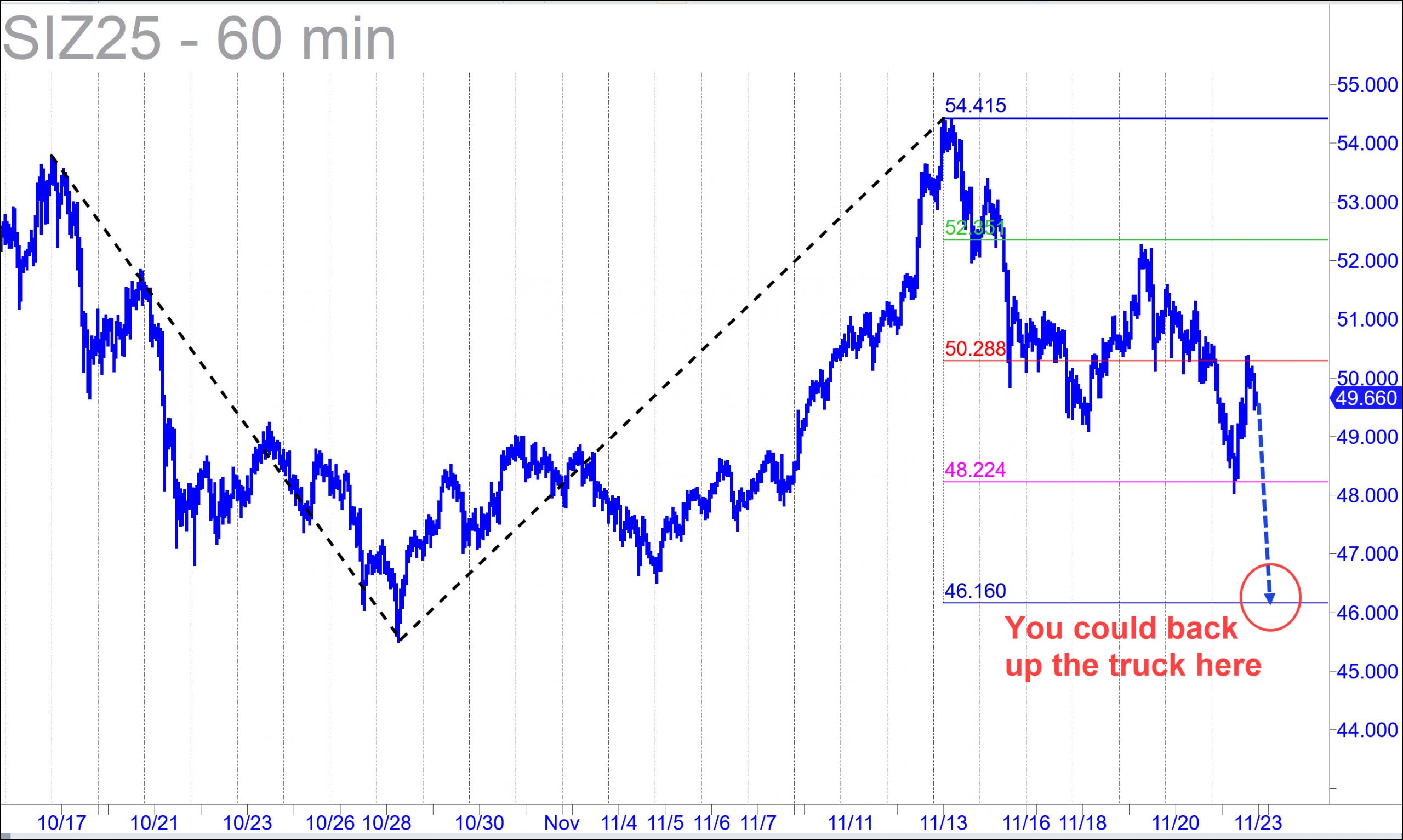 You could back up the truck and buy ’em at 46.16 the ‘d’ target of the pattern shown, although there are no assurances the futures will get there. Odds are somewhat in favor of it, since the pattern has already produced three theoretically profitable trades: a conventional short at the green line, a mechanical short on the rally back up to it, and a buy at 48.224, the secondary Hidden Pivot support. It would take a rally exceeding the 52.245 peak from November 19, for bulls kick-start the long-term uptrend. _____ UPDATE (Nov 28, 12:15 p.m. EST): Silver has exploded this morning and is currently up $3.01/oz, trading well above a would-be daunting Hidden Pivot resistance at 56.05 (basis the January contract). The next HP of consequence is 57.61, which can serve as a minimum price objective for now. If it is decisively exceeded, that would imply further potential to 63.50, or even 69.40. Both targets come from the weekly chart of the January contract, where A= 30.27 on 4/4/25.
