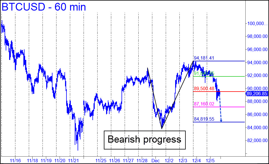 Although Bitcoin ended the week in a mild selloff, it occurred in the context of a bullish cycle begun two weeks ago from 80,526. The correction would need to hit d=84,819 to set up an attractive buy, and a run-up in the meantime to x=91,840 would trigger a ‘mechanical’ short. This would be a one-level trade with p=89,500 as the profit goal, although that doesn’t rule out additional downside to p2=87,160, or even to d=84,819 over the very near term. _______ UPDATE (Dec 8, 12:12 p.m.): The short sale detailed above worked out nicely and could have been covered this morning for an overnight profit of around $2,300. As expected, Sunday’s rally was short-lived and exceeded the green line by just 0.4% before receding to within a hair of p=89,500. The recommendation was explicitly detailed and, presumably, clear enough for any subscriber to have done the trade. Any reports?