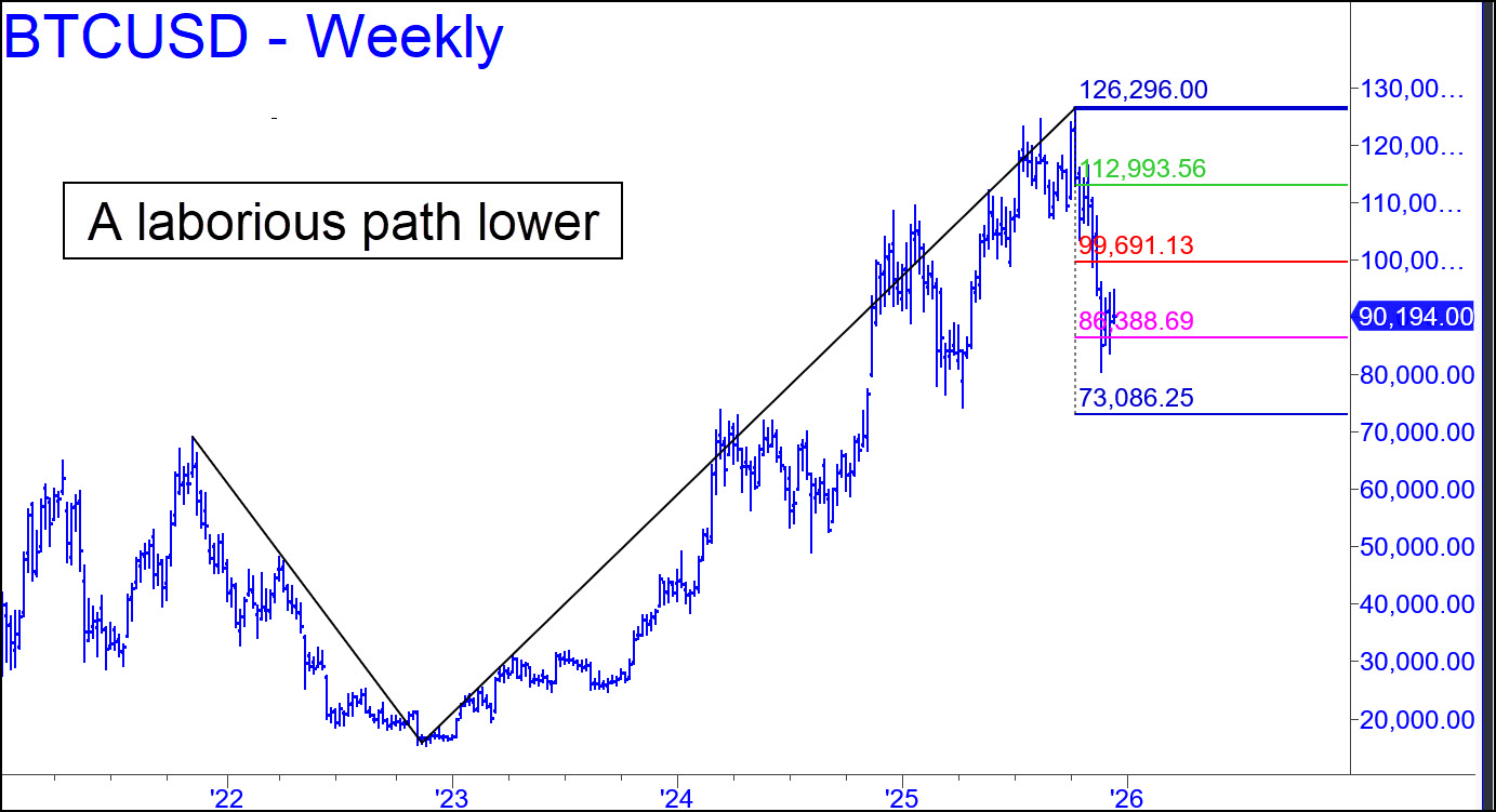 I hesitate to call Bitcoin’s laborious 36% selloff from the $126k top in mid-October a correction, since there’s a good chance it’s in a bear market and that it will never exceed that high. That will almost surely be the case if stocks have entered a bear market. It would likely be the worst since the 1930s, creating an investment environment in which a purely speculative hobgoblin such as Bitcoin could never survive, let alone flourish. Trump’s MAGA narrative would also be a casualty, since merely scraping by, rather than achieving greatness, would become the central concern of most Americans. Regarding the weekly chart that I’ve displayed this week, it leaves little room for doubt that Bitcoin’s selloff will continue down to at least d=73,076. Moreover, a rally from current levels to as high as the green line (x=112,993) would trigger a ‘mechanical’ short, presumably amidst high-fiving by Bitcoin fans excited by the possibility of new record highs. ______ UPDATE (Dec 17, 5:13 p.m.): I’ve posted some finely nuanced downside targets in the chat room that are actionable. Check ’em out!